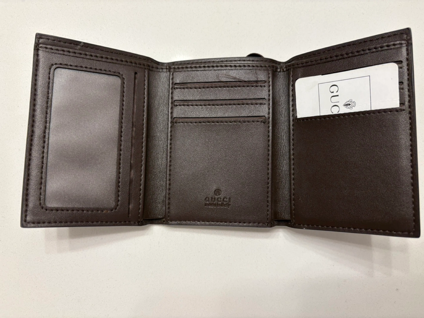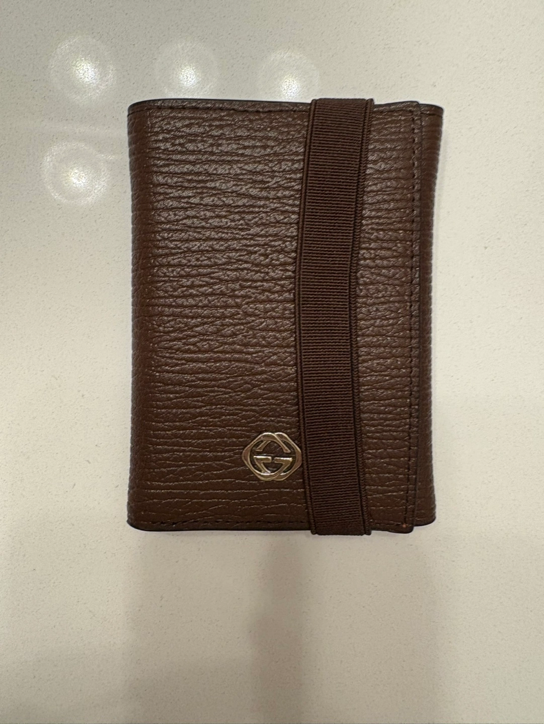 Brown leather trifold wallet. Features multiple card slots and a billfold. Gold-toned Gucci logo. Elastic band closure.