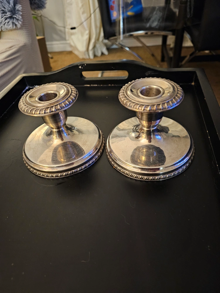 688Elegant pair of silver candle holders. Classic design. Includes a clear glass vase. Perfect for home décor.