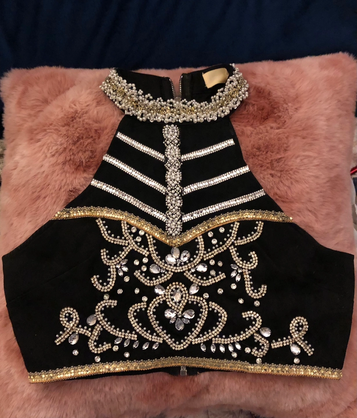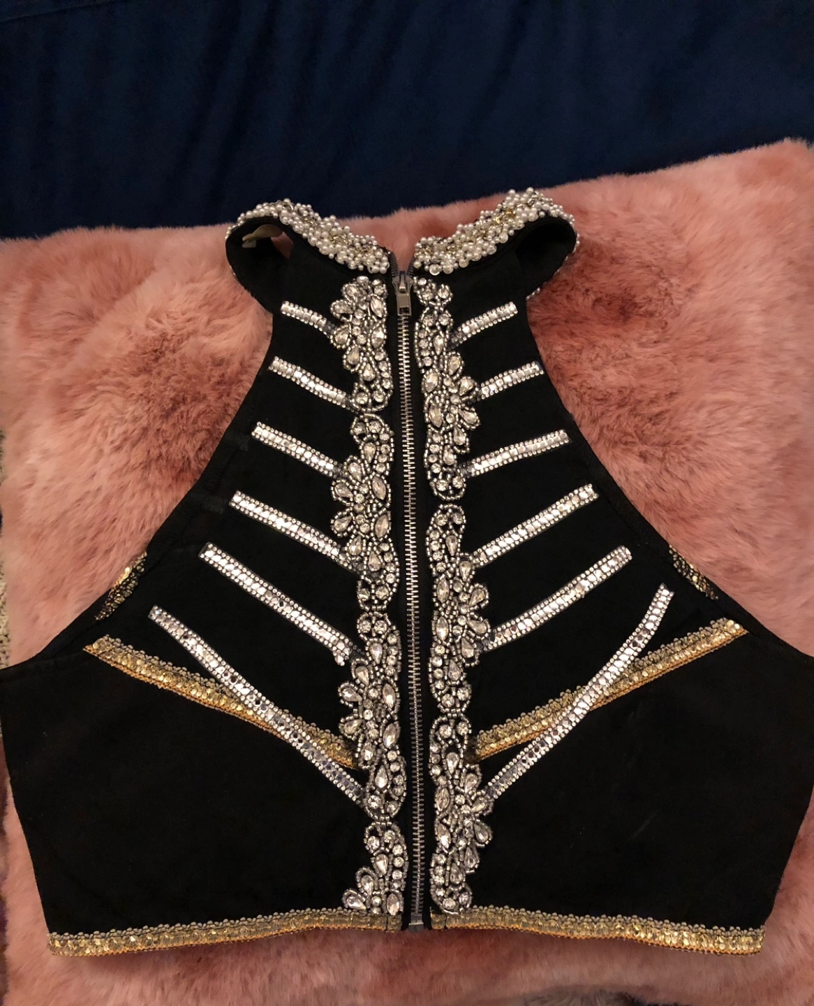 Black halter neck crop top. Heavy embellishments. Rhinestones and pearls. Gold accents. Back zipper closure. Unique design.