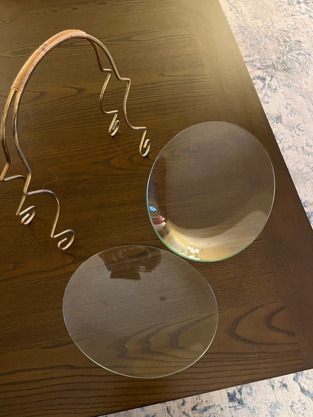 Elegant two-tiered serving stand. Features round glass plates and a decorative metal frame with a woven handle. Perfect for parties or everyday use.