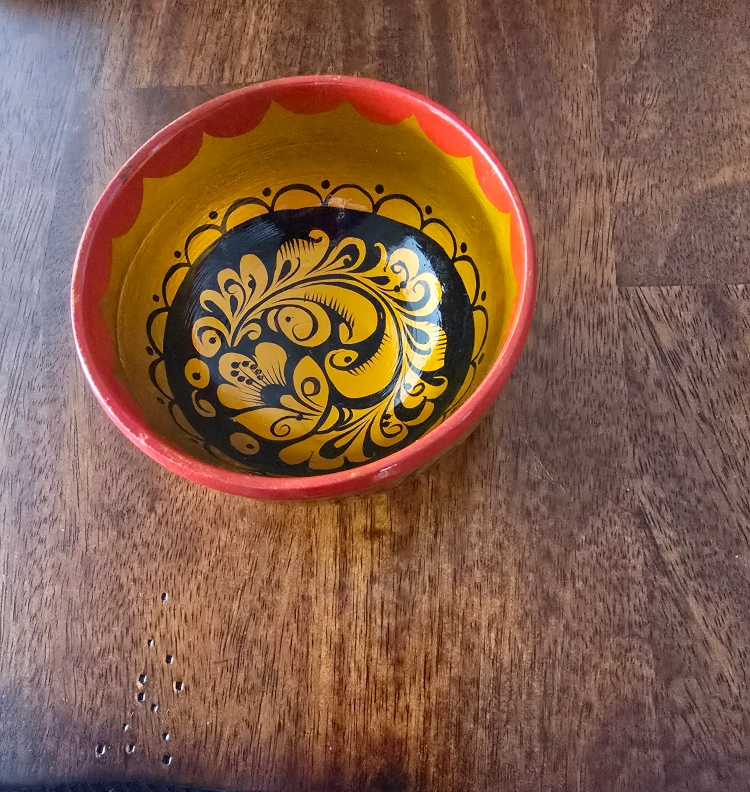 116Small wooden bowl. Hand-painted with floral design. Yellow, black, and red colours. Unique folk art style.
