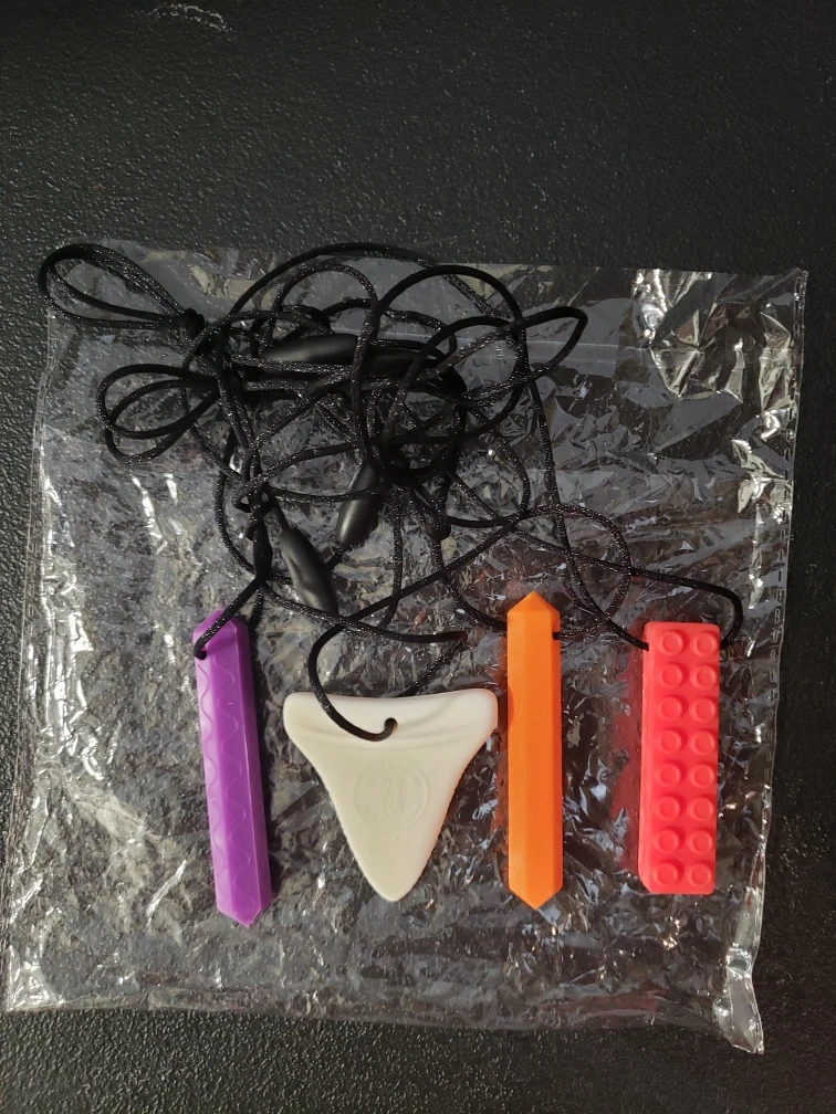 Set of four silicone chew pendants. Includes purple, orange, and red pieces, plus a white shark tooth design. Black cord necklace. Great for teething or sensory needs.
