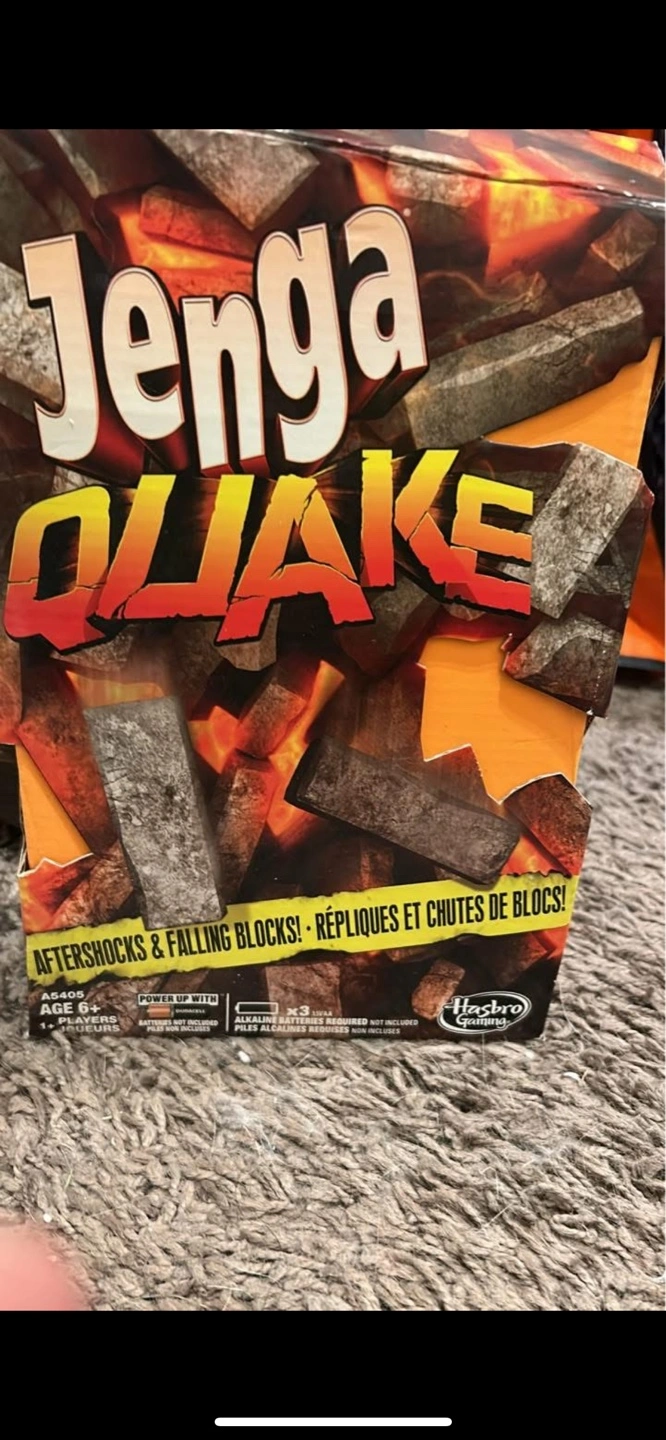Jenga Quake game. Aftershocks and falling blocks. Requires 3 alkaline batteries (not included). For ages 6 and up. 1+ players.