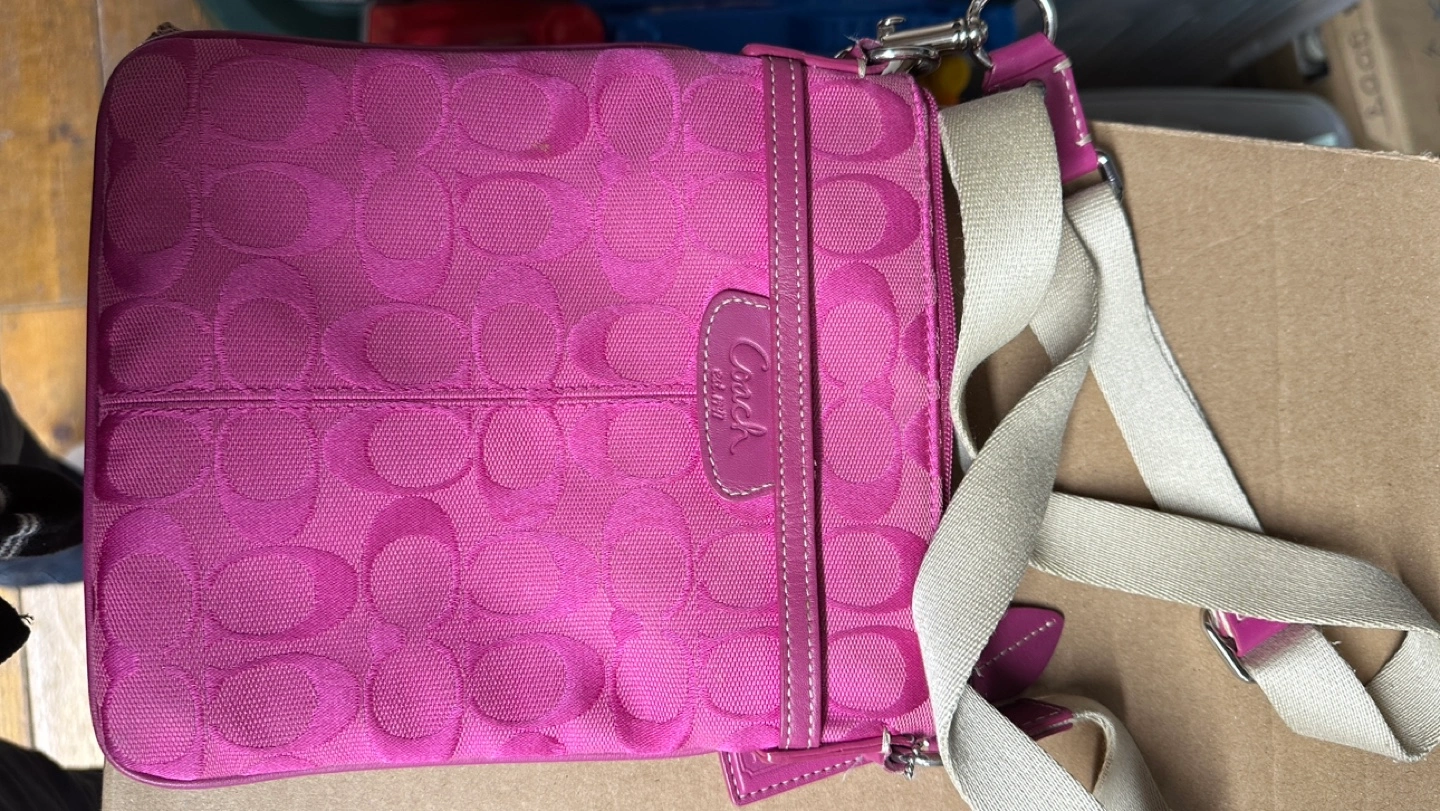 Pre-owned Coach crossbody bag. Pink signature canvas. Features a zipper closure and adjustable strap. Great for everyday use.