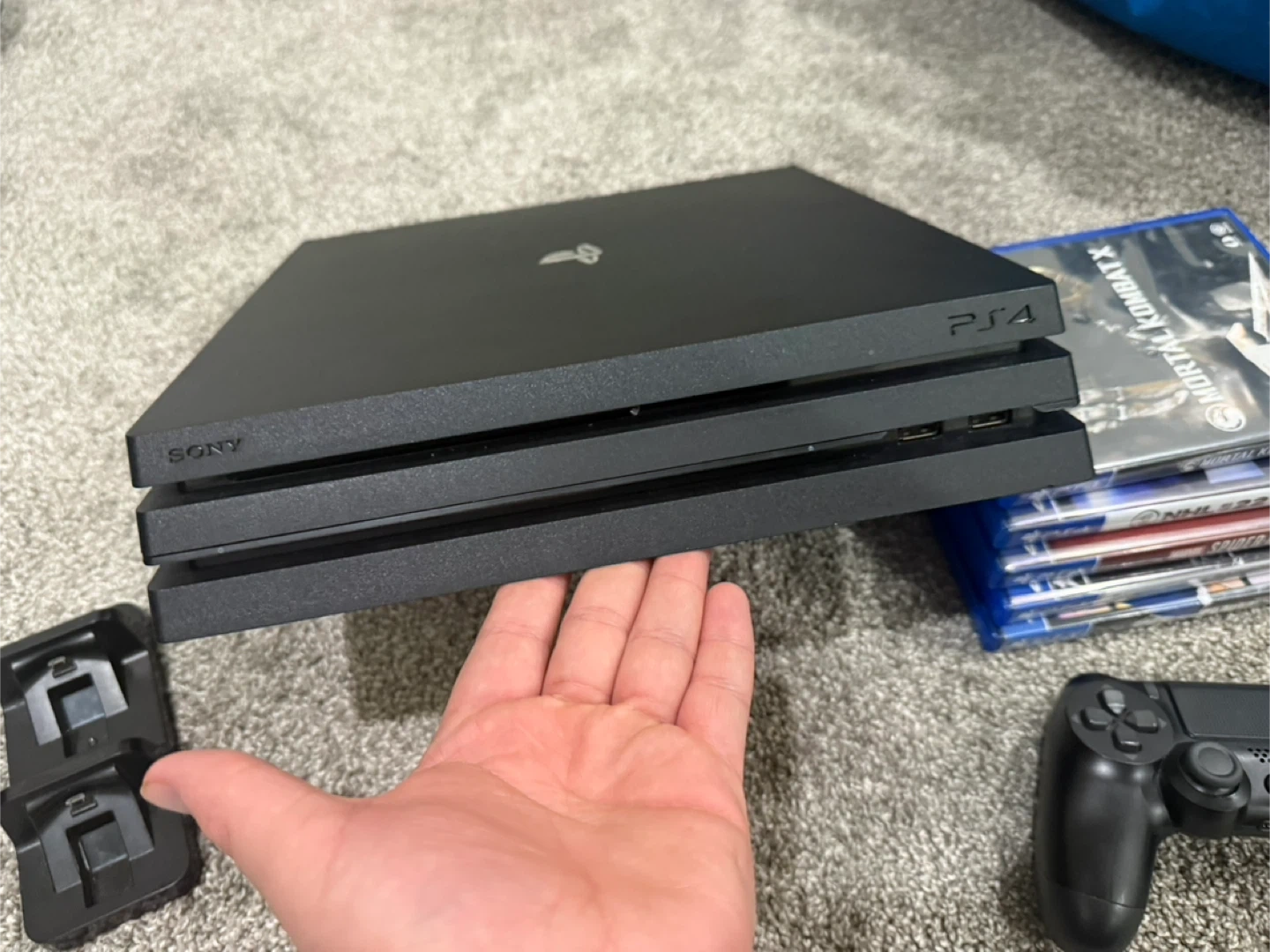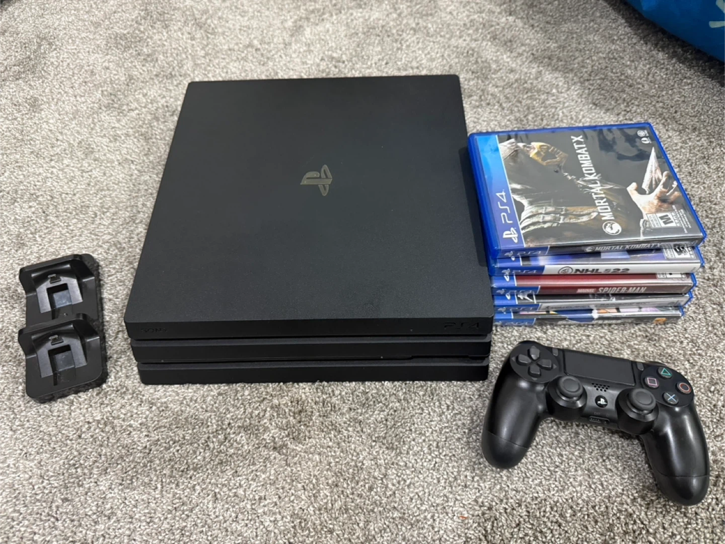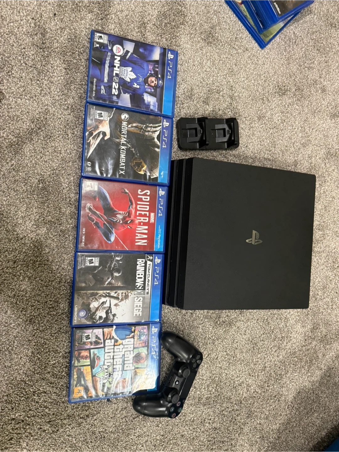 This is a Sony PlayStation 4 Pro console with 1TB of storage. It comes with one controller, a charging dock, and several games including Grand Theft Auto V, Tom Clancy's Rainbow Six Siege, Marvel's Spider-Man, NHL 22, and Mortal Kombat X. It's in black.