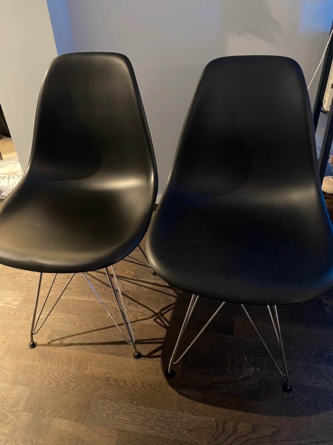 Two black plastic chairs, chrome legs. Modern design. Versatile and can serve as dining chairs, office chairs, living room chairs, etc. Good condition. Sold as a pair.