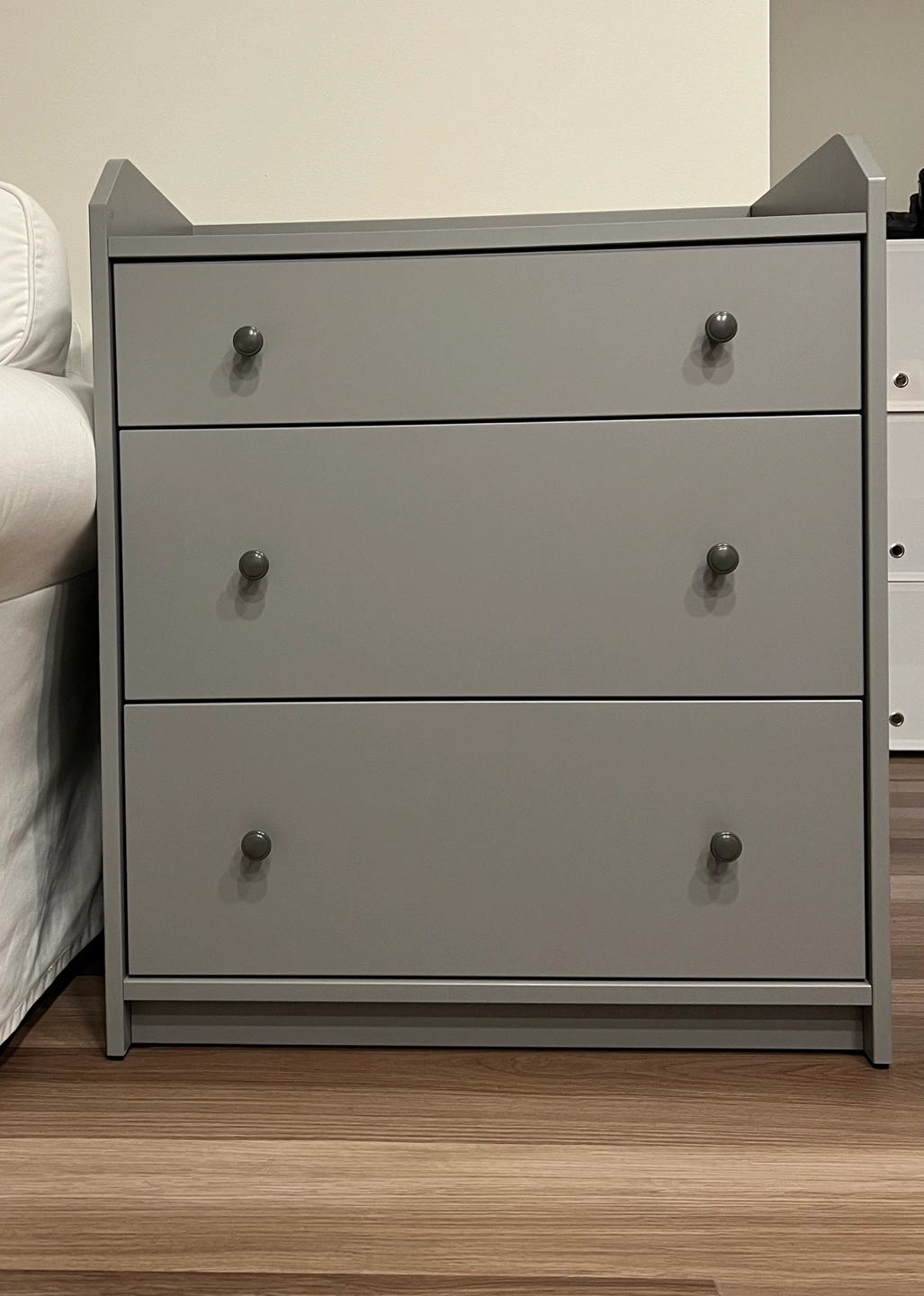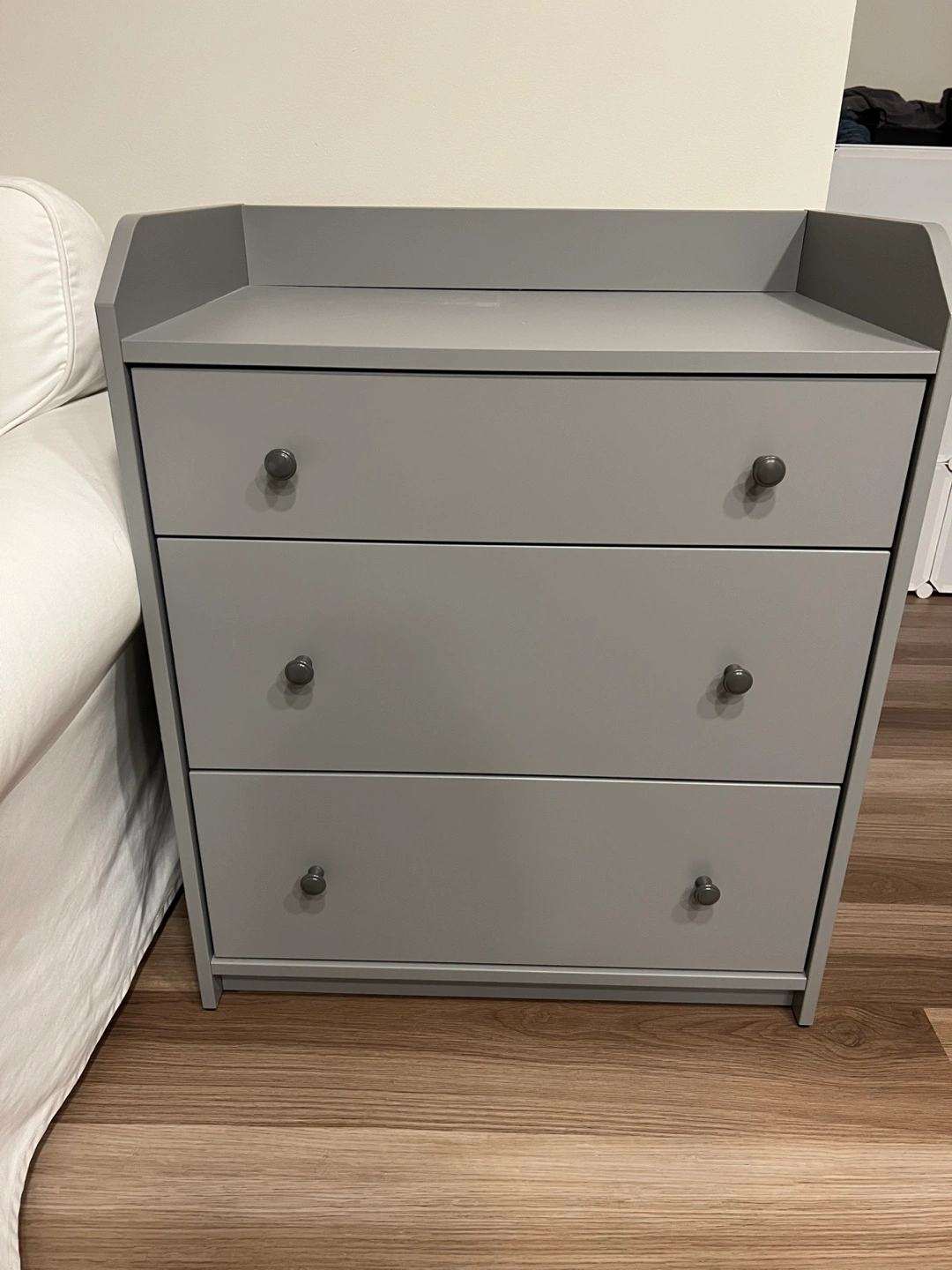 Three-drawer dresser, grey colour. Simple design, functional storage. Good condition. Barely used in a year, no damages.