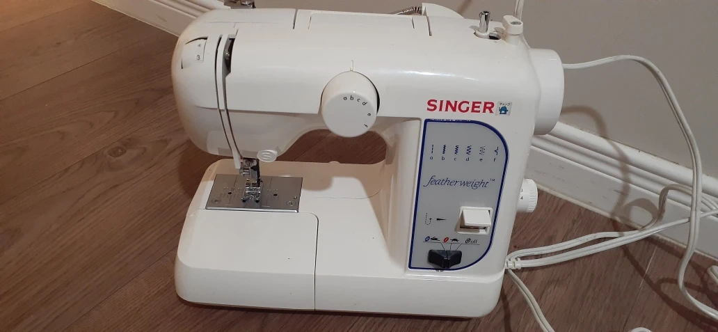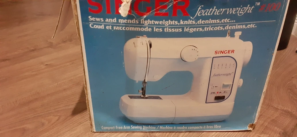 Vintage Singer Featherweight 100 sewing machine. Compact design. Free arm. Sews lightweights, knits, denims. Comes in original box.
