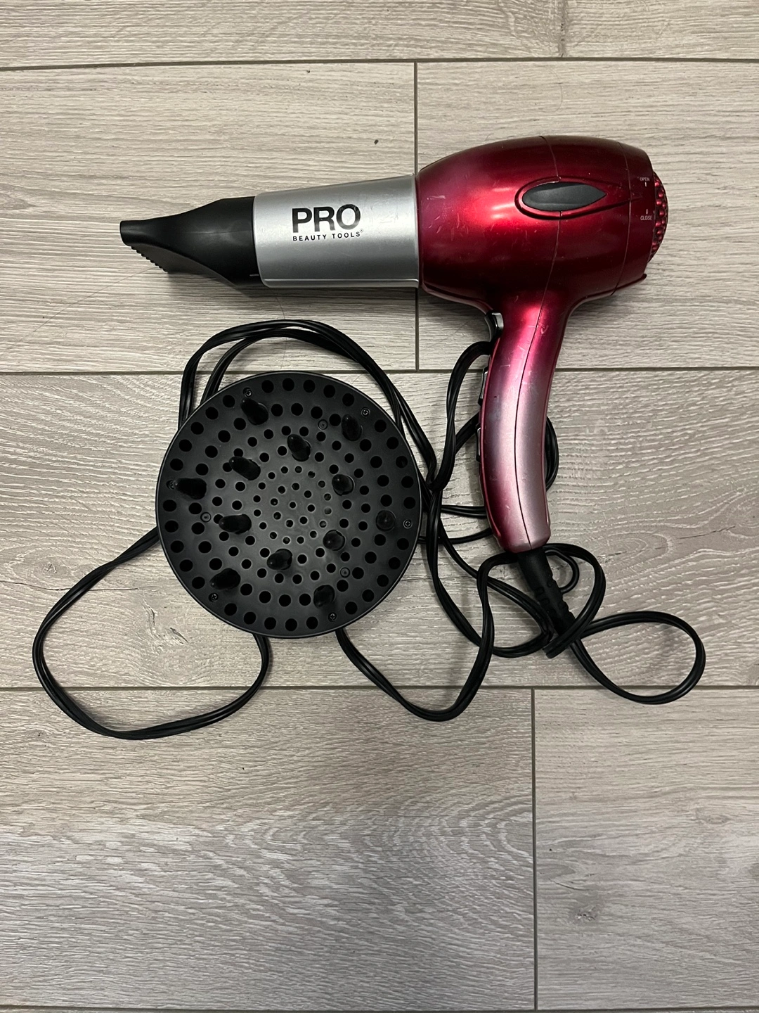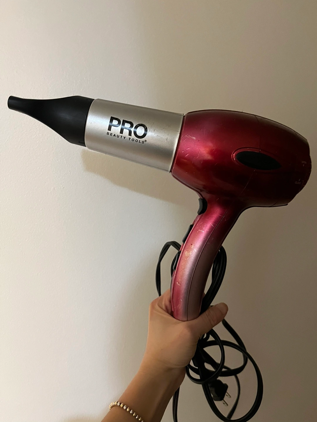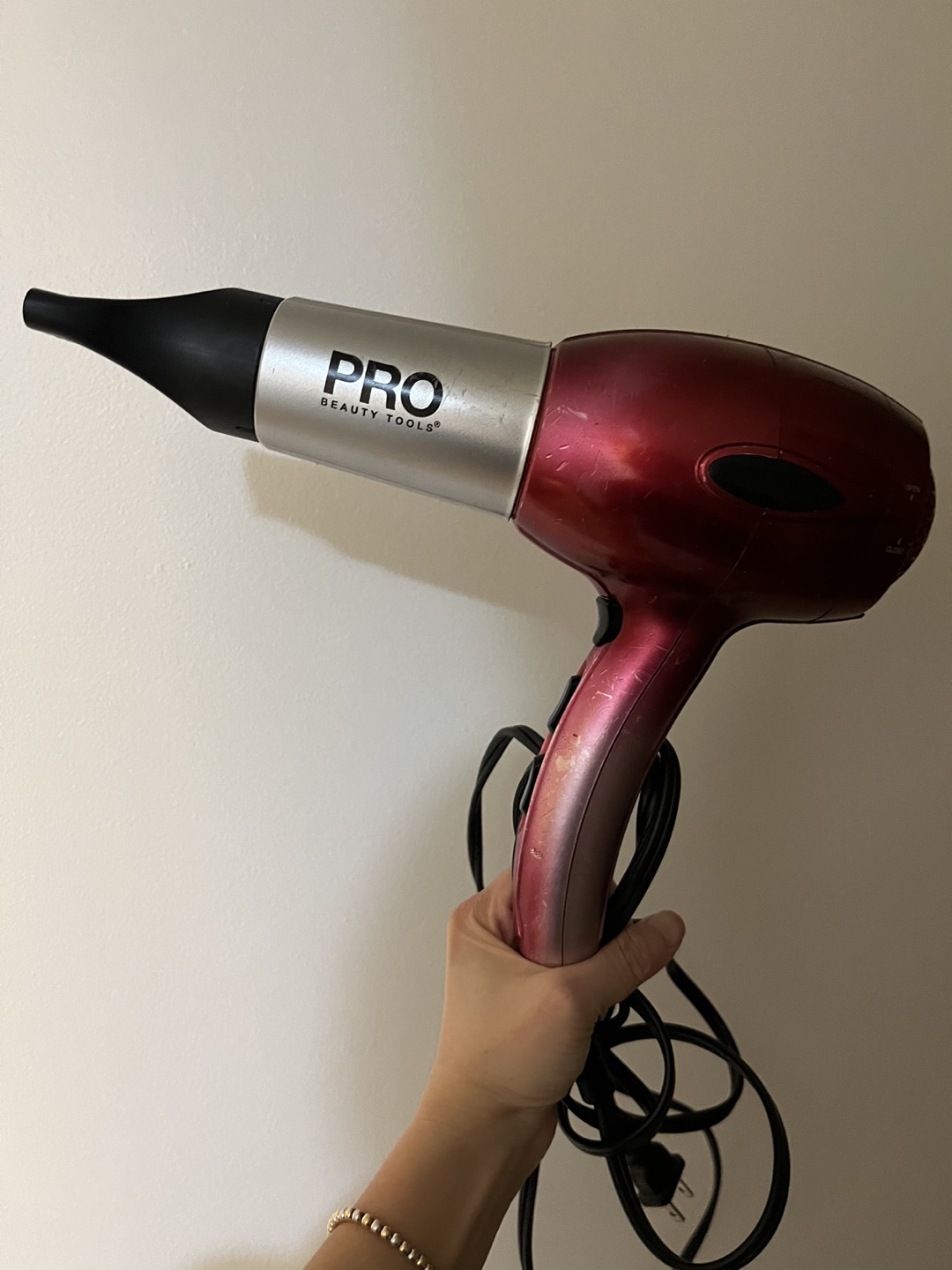 FREE Red and silver hair dryer. Includes concentrator attachment. Pre-owned. Dryer working well, used so aesthetic paint is faded.
