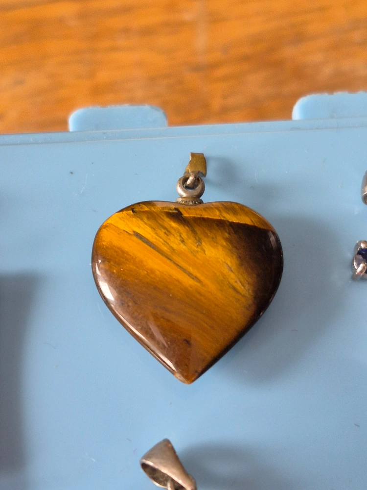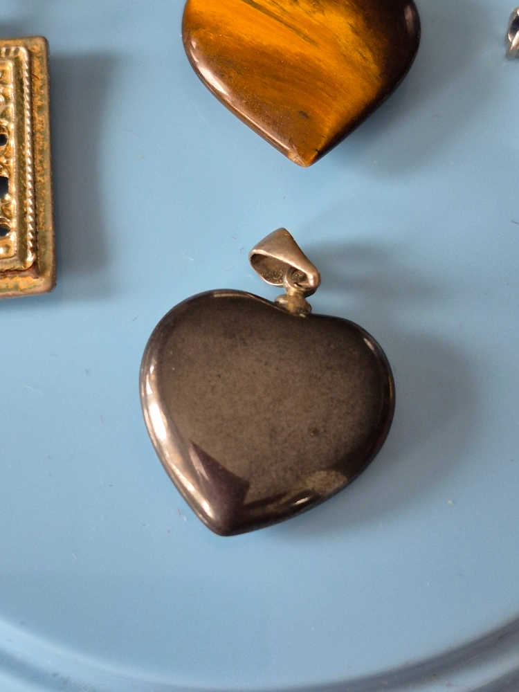 Two beautiful Gemstone, heart shape pendants. One tiger eye, one hematite. Silver-toned metal bail. Unique jewellery. Great as a gift or for yourself.