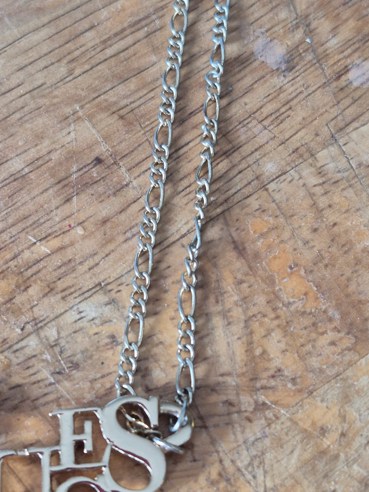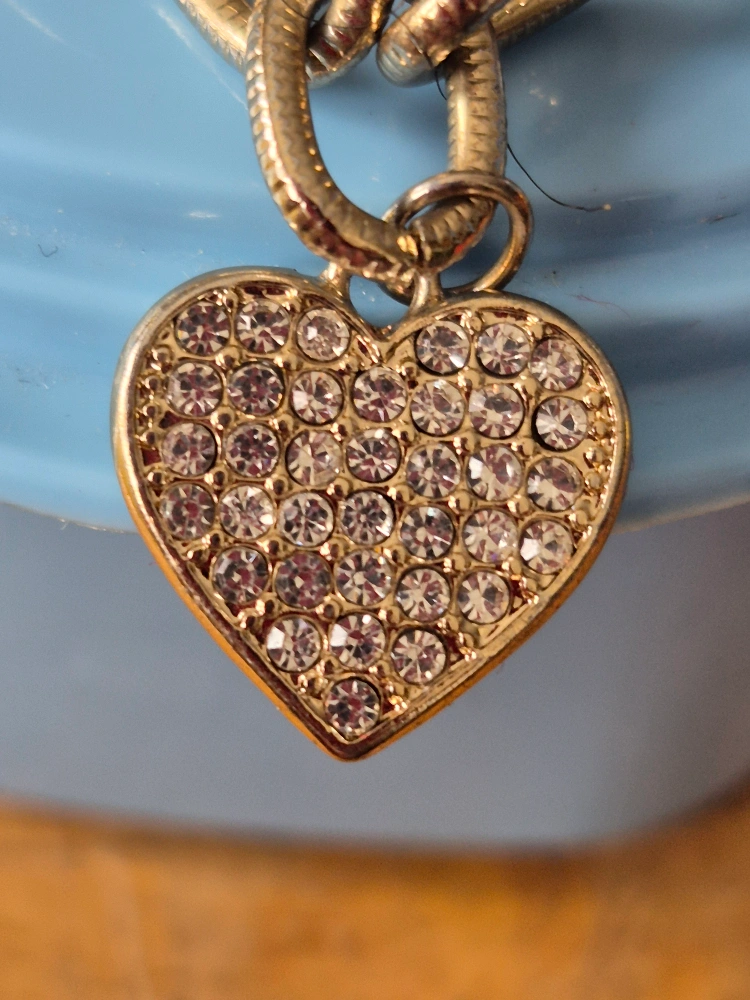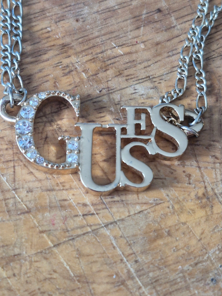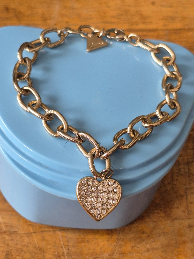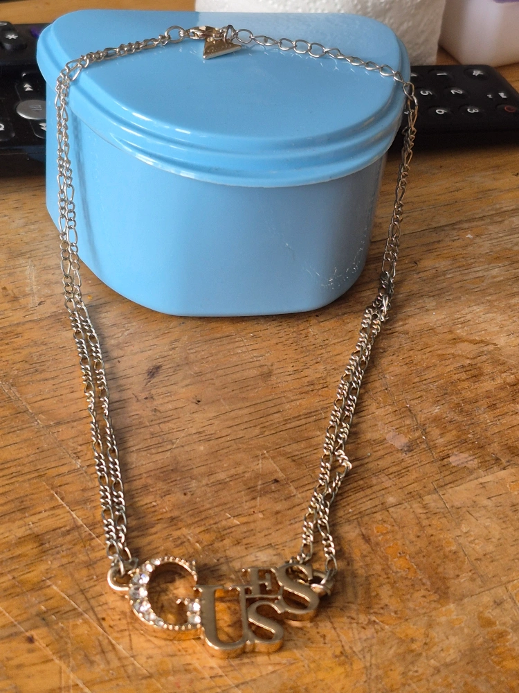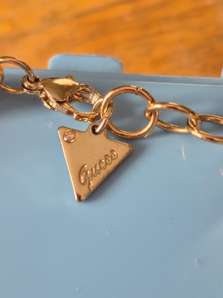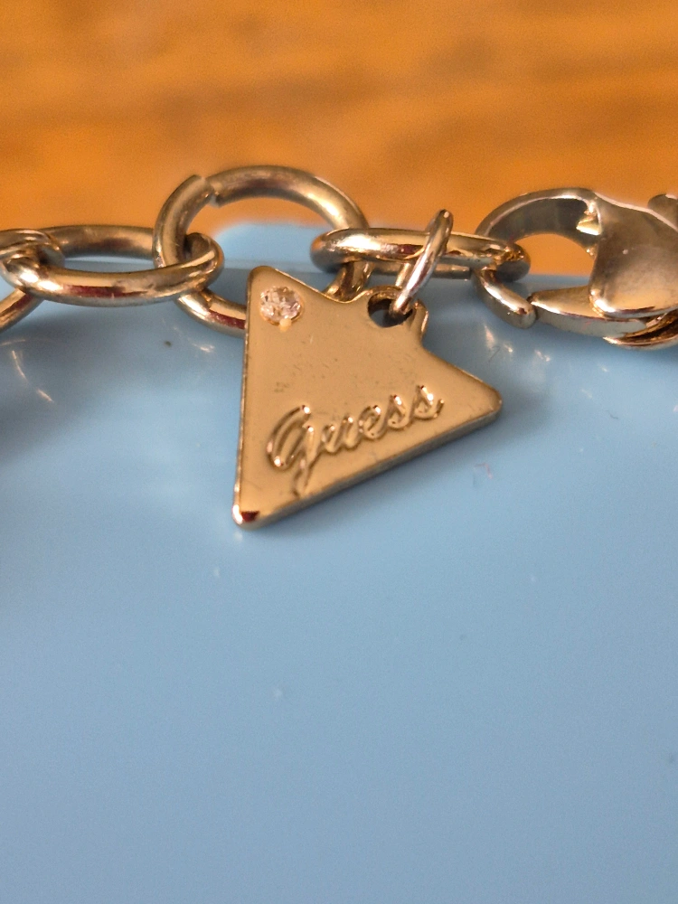 Two Guess bracelets. 1 gold tone chain and a pave heart charm. The other is a silver tone mesh design with a gold tone Guess logo bar- (SOLD ) Both have a lobster clasp and triangular Guess logo charm. 1 Guess logo Necklace gold tone and rhinestones. In Excellent Condition. like New. $10.00 each