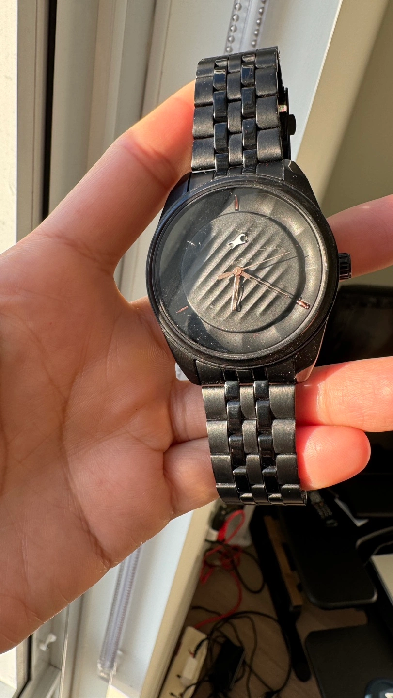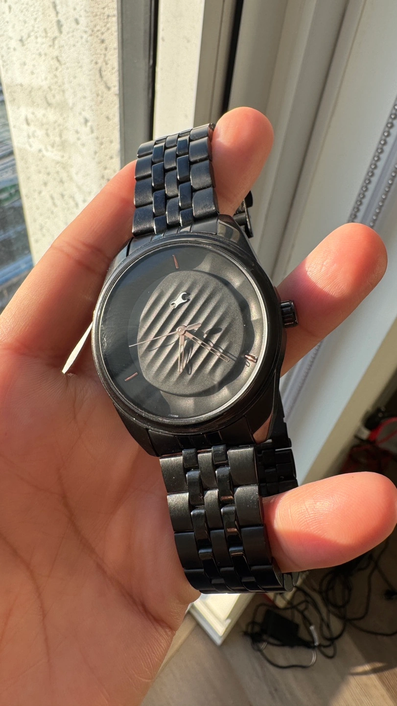 Men's black analogue wristwatch. Black metal band. 50M water resistant. Minimalist design.