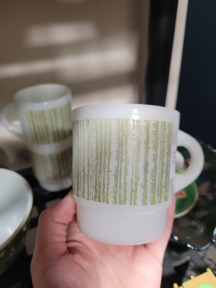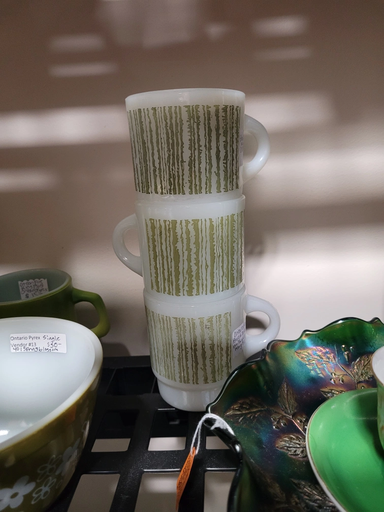 Set of three vintage milk glass mugs. Green and white colour scheme. Stackable design. Perfect for adding a retro touch to your kitchen. I restrict myself to only collecting one milk glass mug of each pattern. I would like to trade for other patterns or iso items. Trade value $5 per mug. no etransfer. cash or swap only. Preference is to quick pickup at 391 attwell drive during monday to friday 830am to 430pm by appointment.