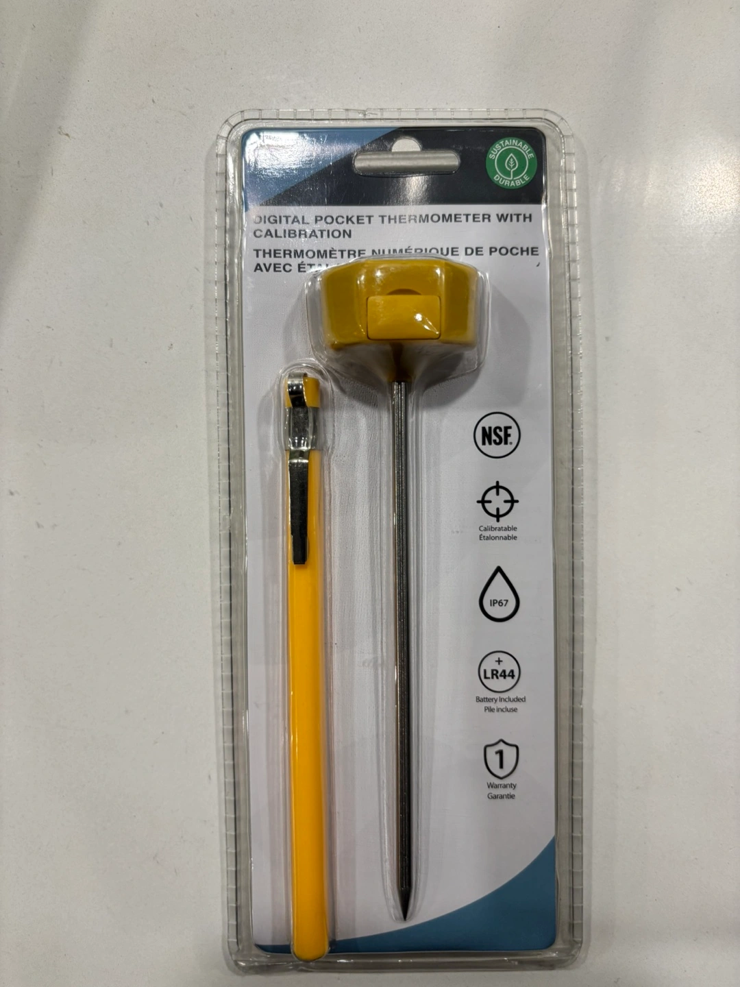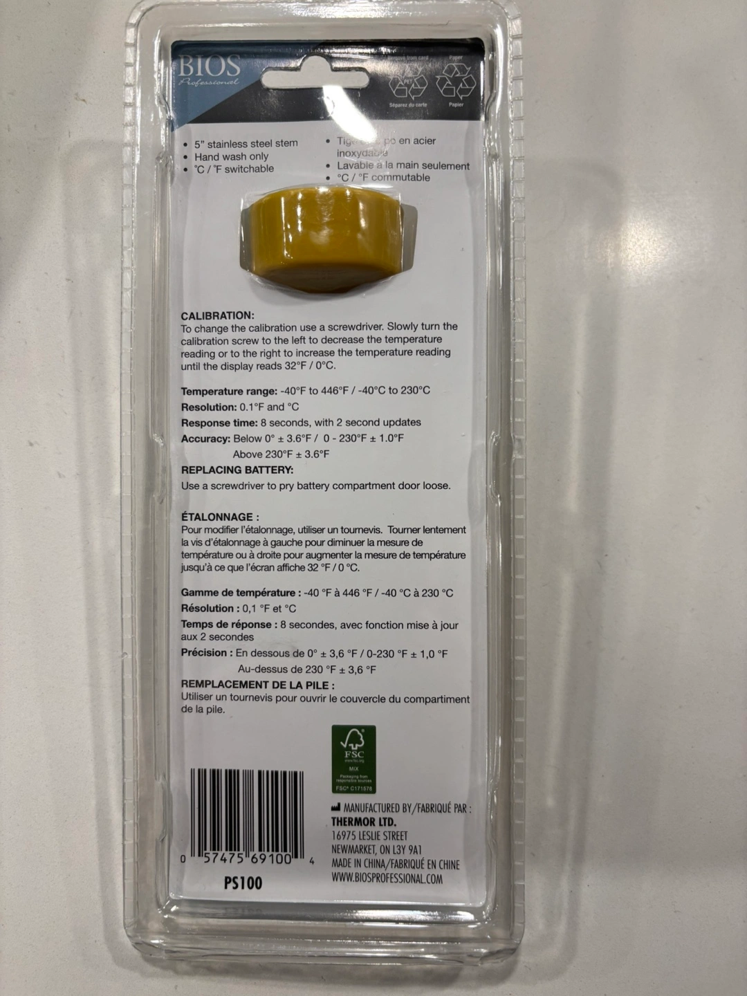 Stainless steel stem. Hand wash only. °C/°F switchable. Calibration screw. Temperature range -40°C to +230°C. Includes battery. 1 year warranty.