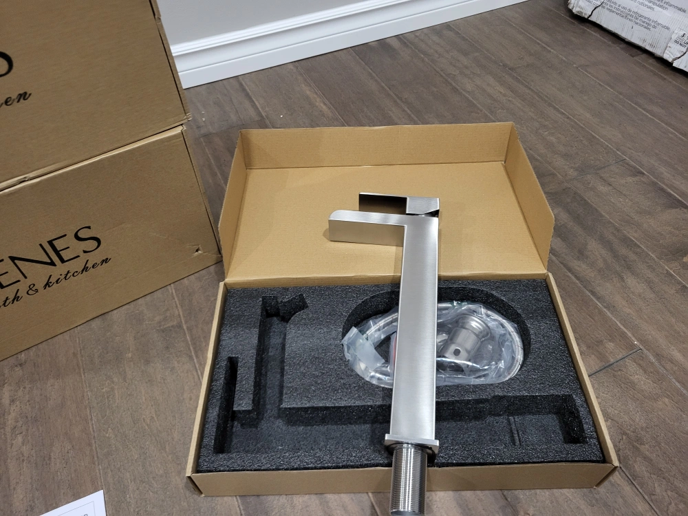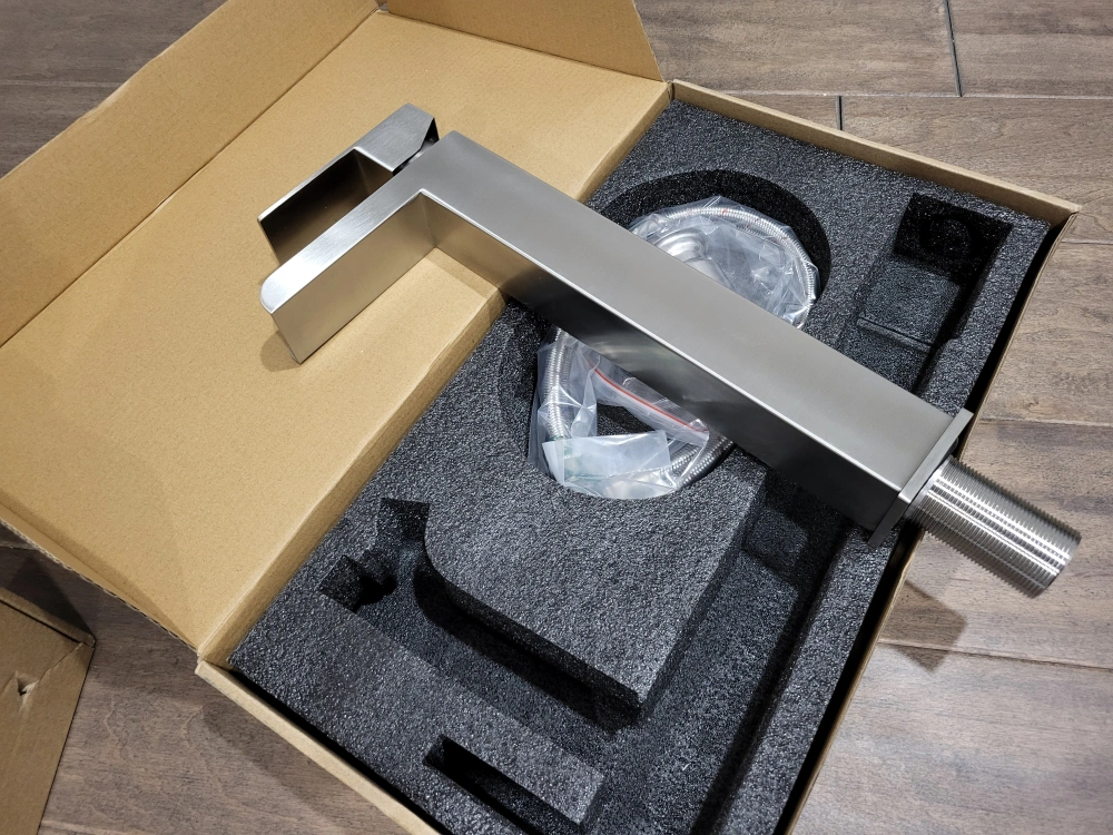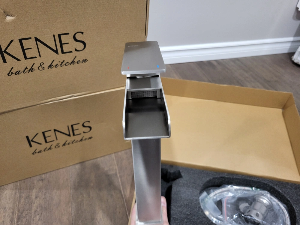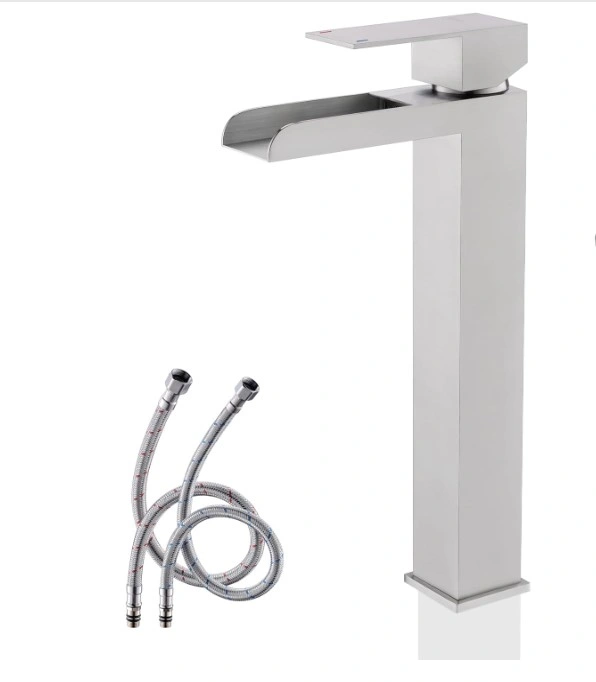 Modern single lever basin mixer tap. Brushed nickel finish. Includes hot and cold water supply hoses. New in box. waterfall bathroom vessel faucet.
