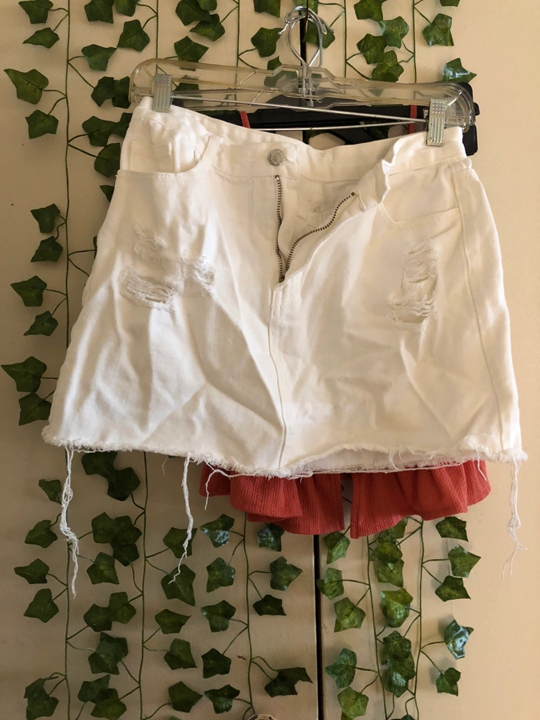 Cute white denim mini skirt. Distressed detailing. Raw hem. Zipper closure. Great for summer.