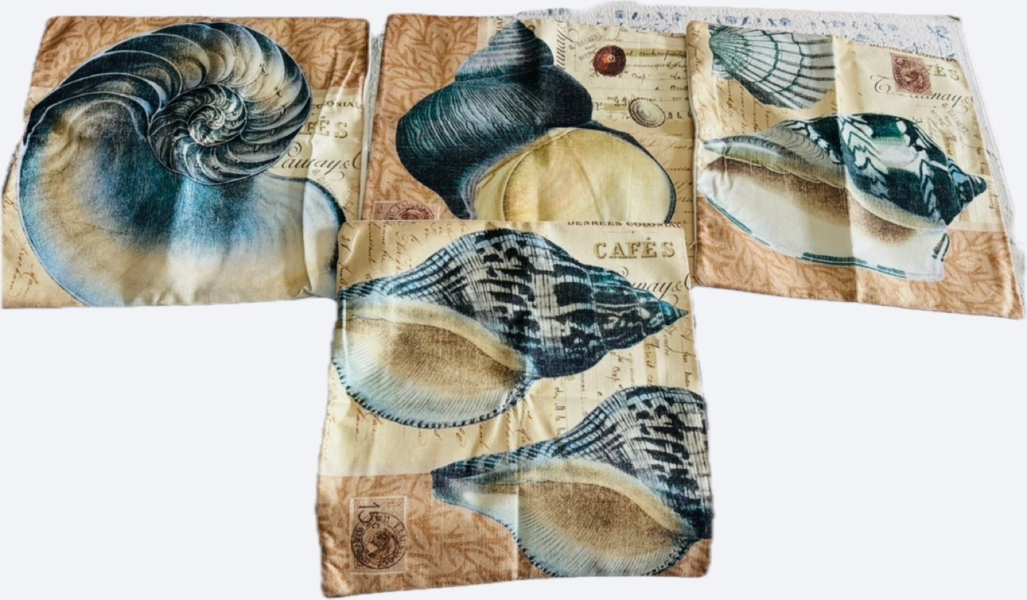 NEW Four decorative pillow covers. Nautical theme. Seashell print. Beige and blue tones. Square shape. Looks great in a beach house or cottage.