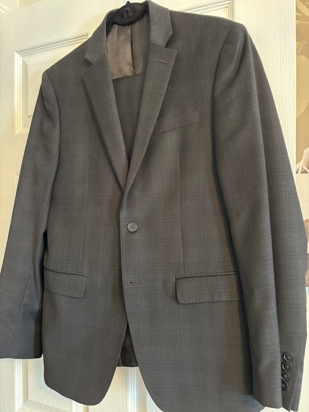 Slim fit suit. Two-button closure. Includes jacket and pants. Great for work or special occasions.