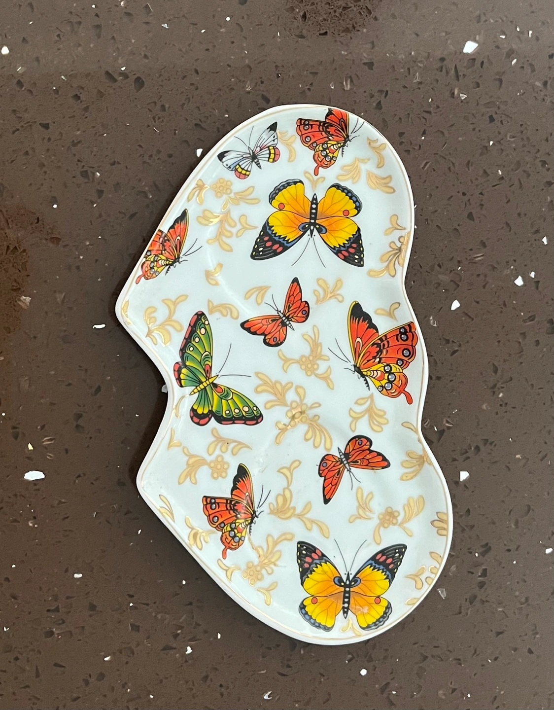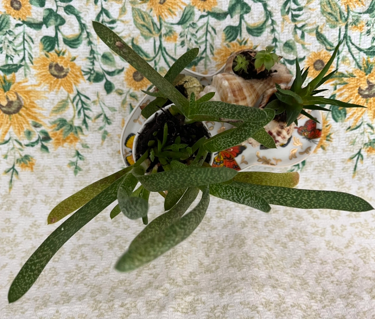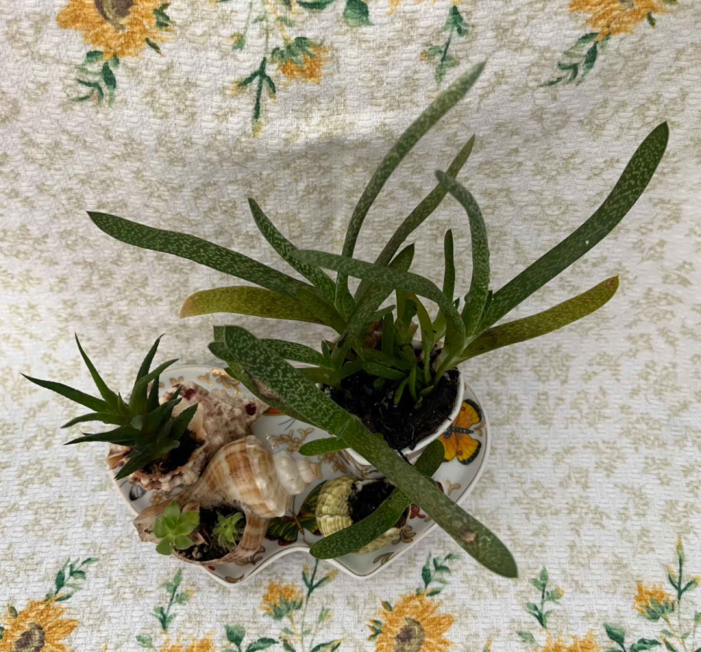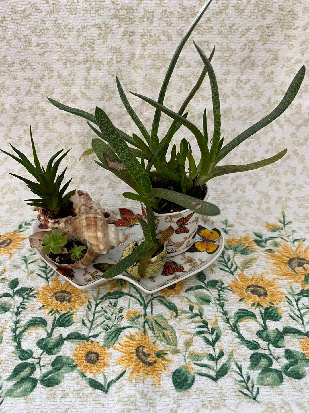 Unique planter featuring three succulents in shells and one in a small pot. Arranged on a decorative Adeline brand plate. Butterflies and gold accents. Perfect for small plants or miniature gardens.