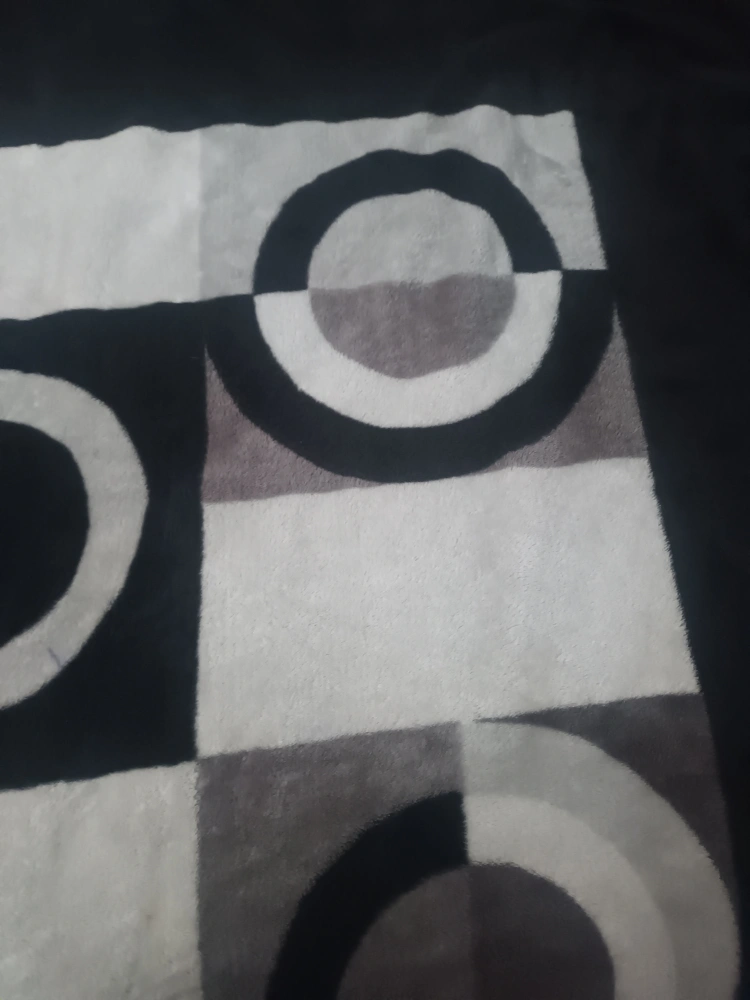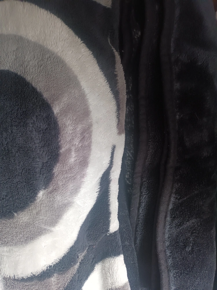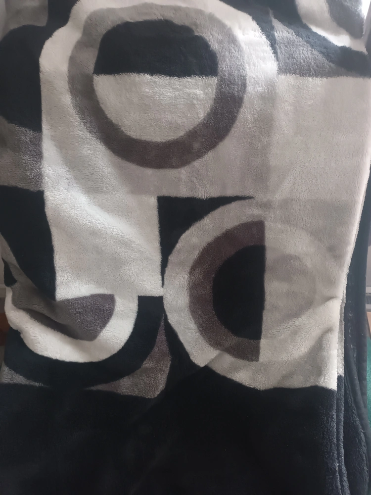 Cozy fleece throw blanket. Features a geometric pattern in shades of black, grey, and white. Perfect for snuggling.