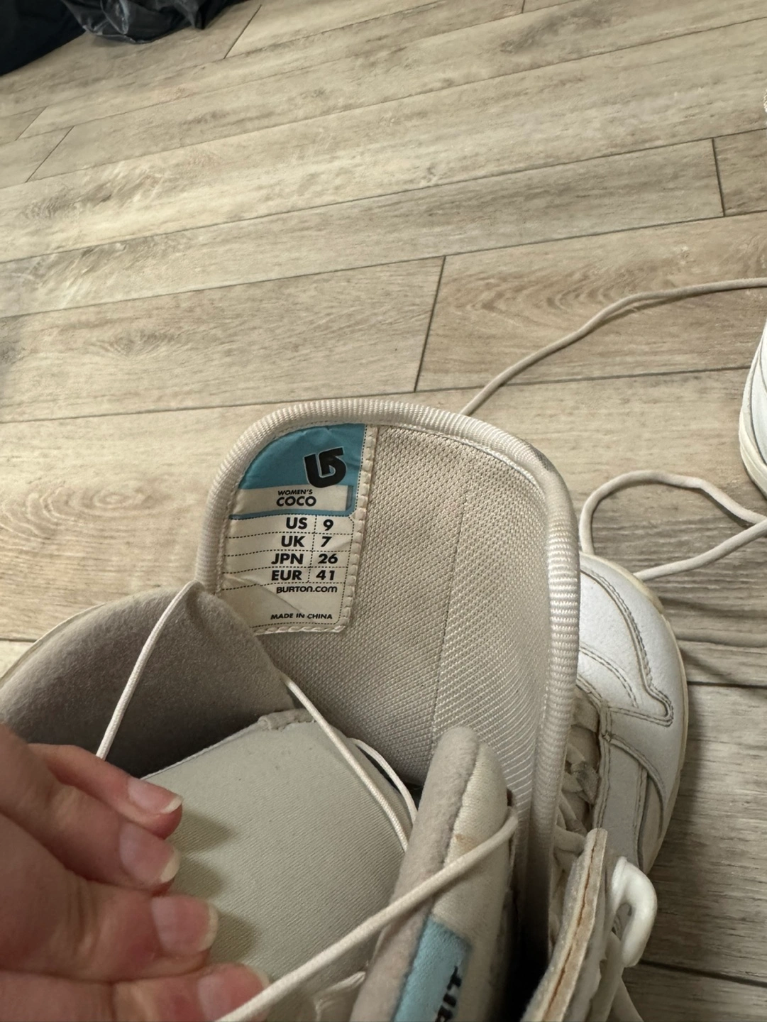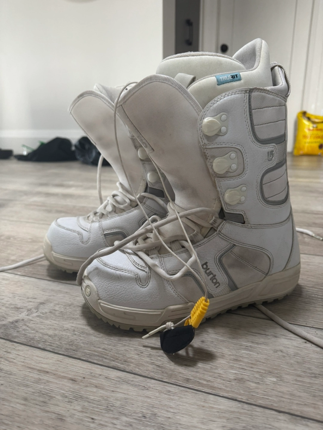 Pre-owned women's Burton snowboard boots. White leather. Size US 9, UK 7, JPN 26. Good condition, minor wear. Includes laces.