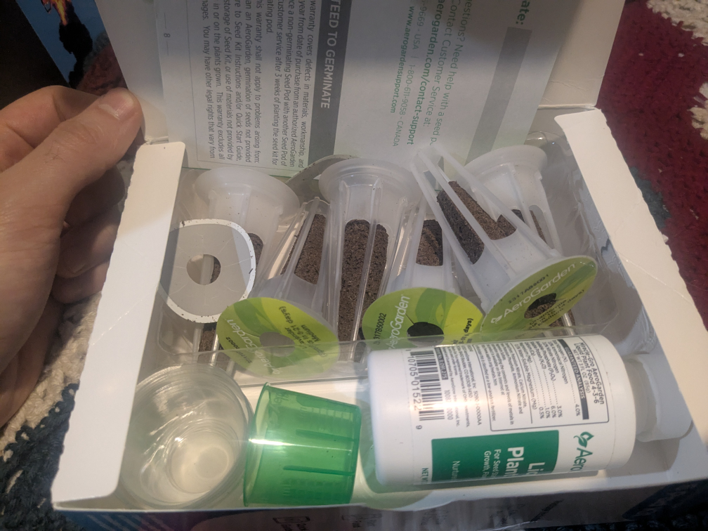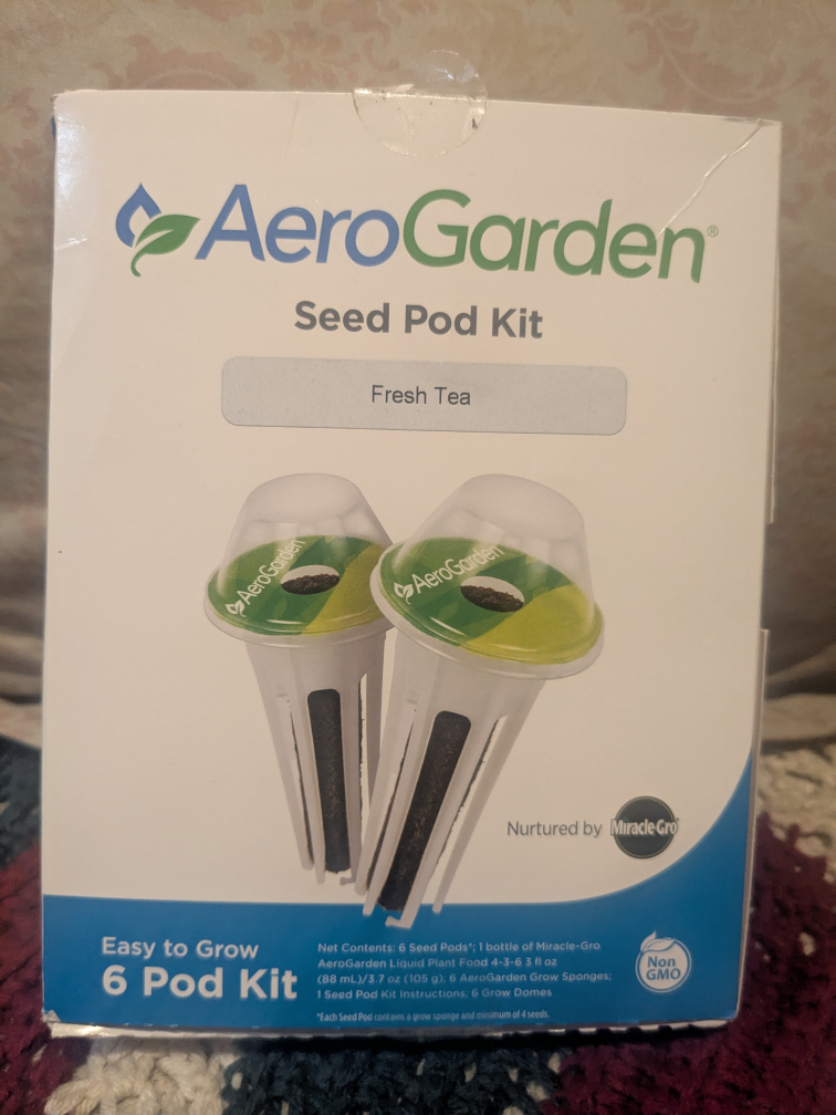 6 seed pods for growing tea. Meant for an AeroGarden, but I'm sure they could sprout without one. 2 pods lavender, 2 pods chamomile, 2 pods peppermint. Includes bottle of Miracle-Gro.