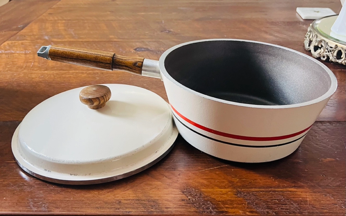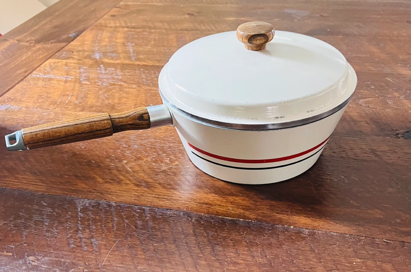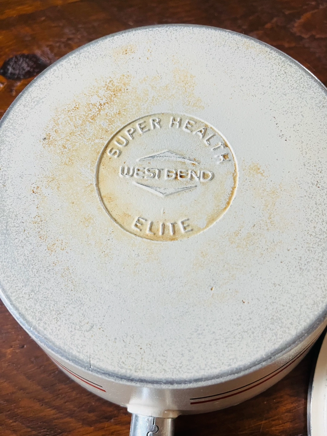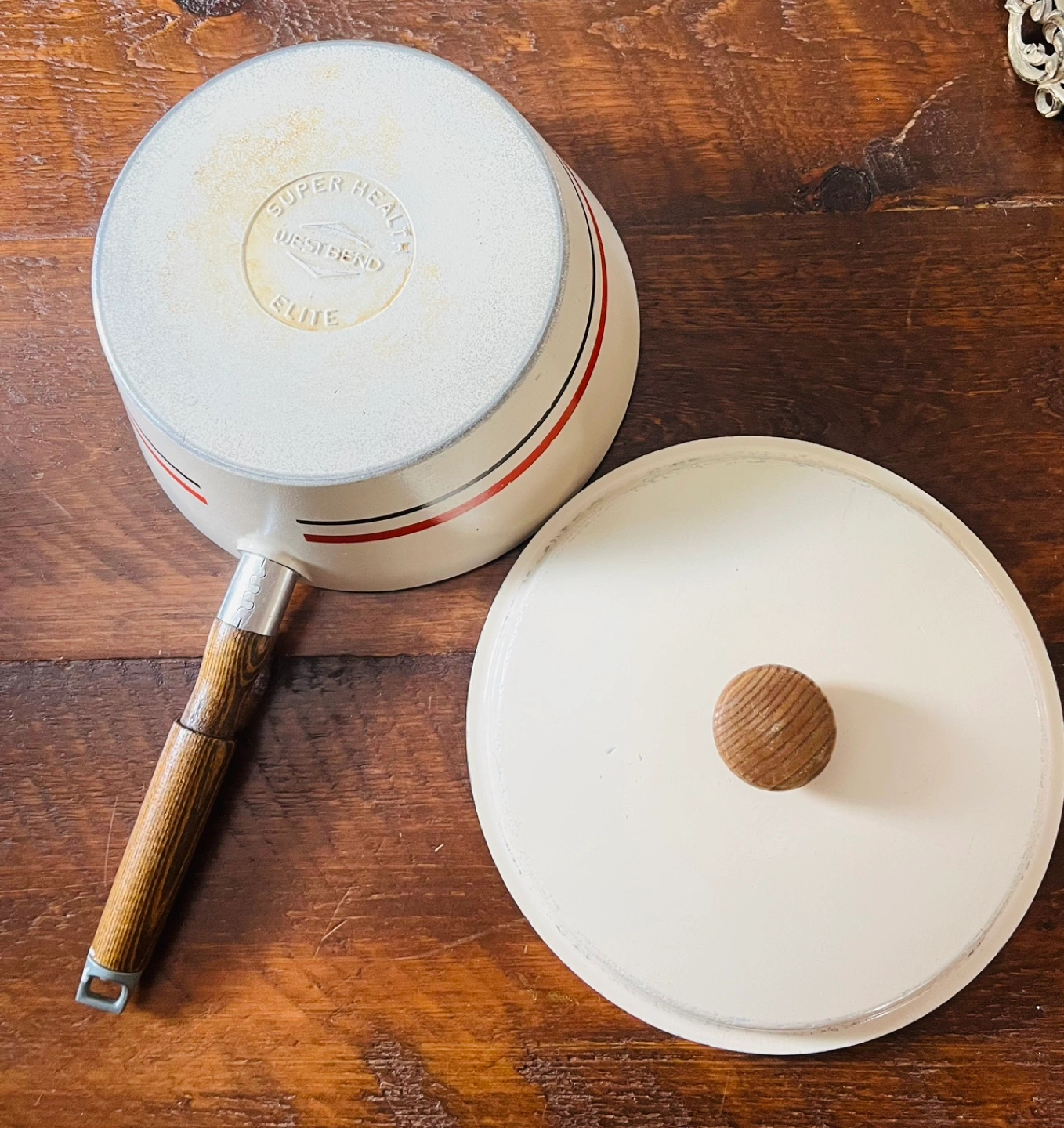 The pictured item is a vintage Westbend Elite Striped Saucepan, not cast iron, but made of cast aluminum. It features an ivory-colored exterior with red and blue stripes, a wooden handle, and a lid. In great vintage condition! 1 quart capacity Durable, thick metal construction Measurements: 13" long with wooden handle 4.5 inch diameter at base (6.25 inches at the top) 3 inches high without lid 5 inches high with lid and wooden knob Weight: 810 grams *** Smoke free home. *** Location: Whitby - Williamsburg which is off of Countrylane between Rossland (if coming from south) and Taunton Rd. (If coming from North).