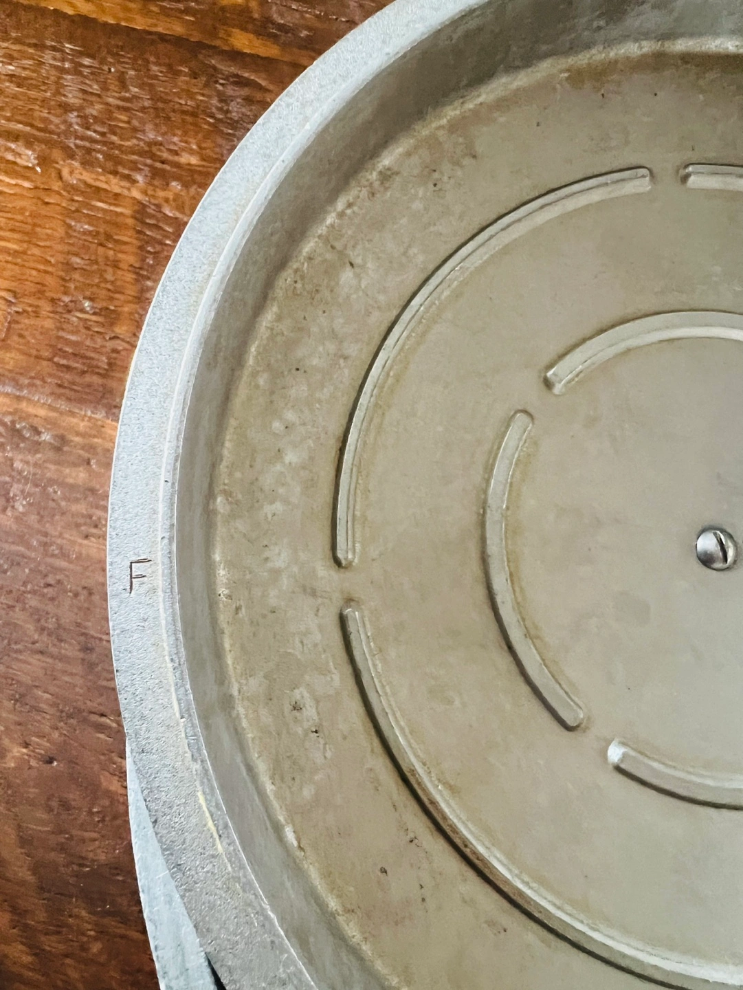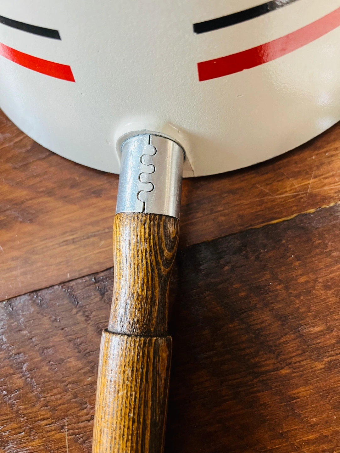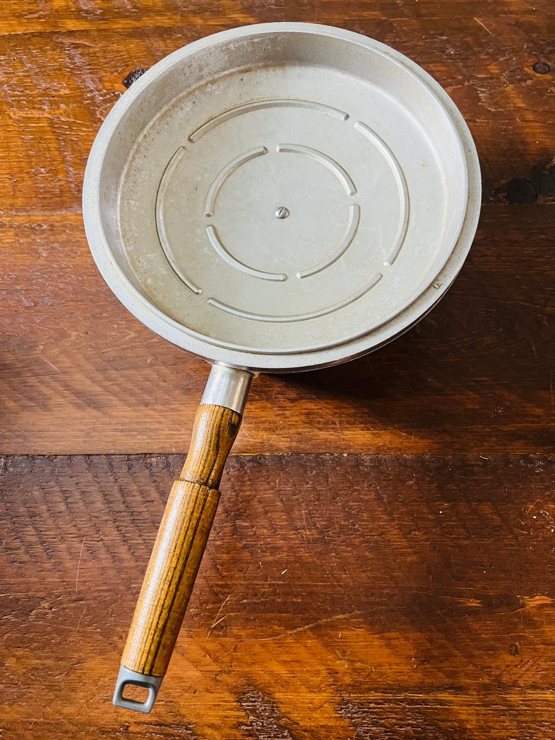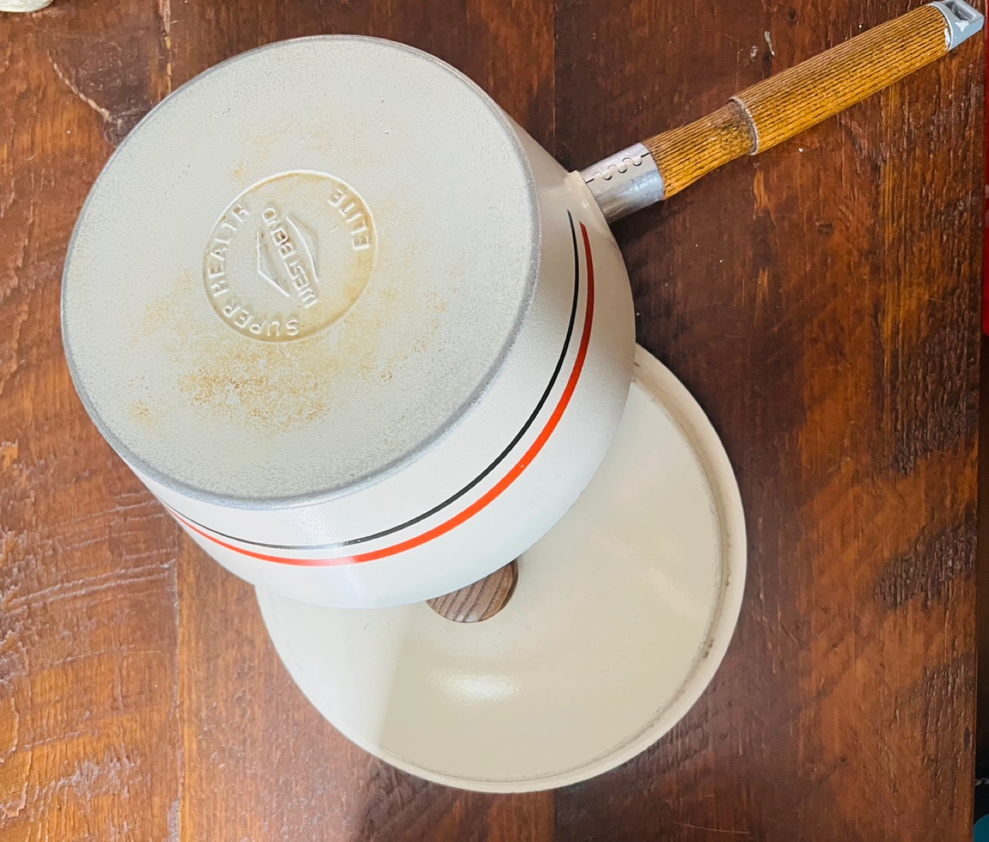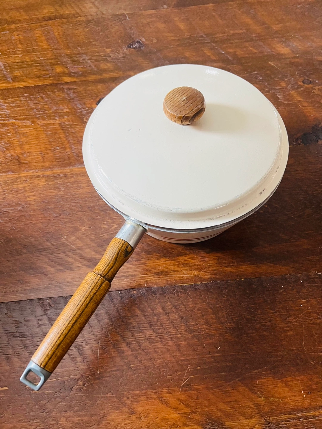 The pictured item is a vintage Westbend Elite Striped Saucepan, not cast iron, but made of cast aluminum. It features an ivory-colored exterior with red and blue stripes, a wooden handle, and a lid. In great vintage condition! 1 quart capacity Durable, thick metal construction Measurements: 13" long with wooden handle 4.5 inch diameter at base (6.25 inches at the top) 3 inches high without lid 5 inches high with lid and wooden knob Weight: 810 grams *** Smoke free home. *** Location: Whitby - Williamsburg which is off of Countrylane between Rossland (if coming from south) and Taunton Rd. (If coming from North).