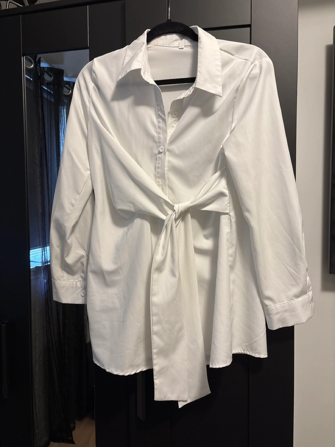 Long sleeve collared button-up shirt. Features a tie at the waist. Lightweight fabric.