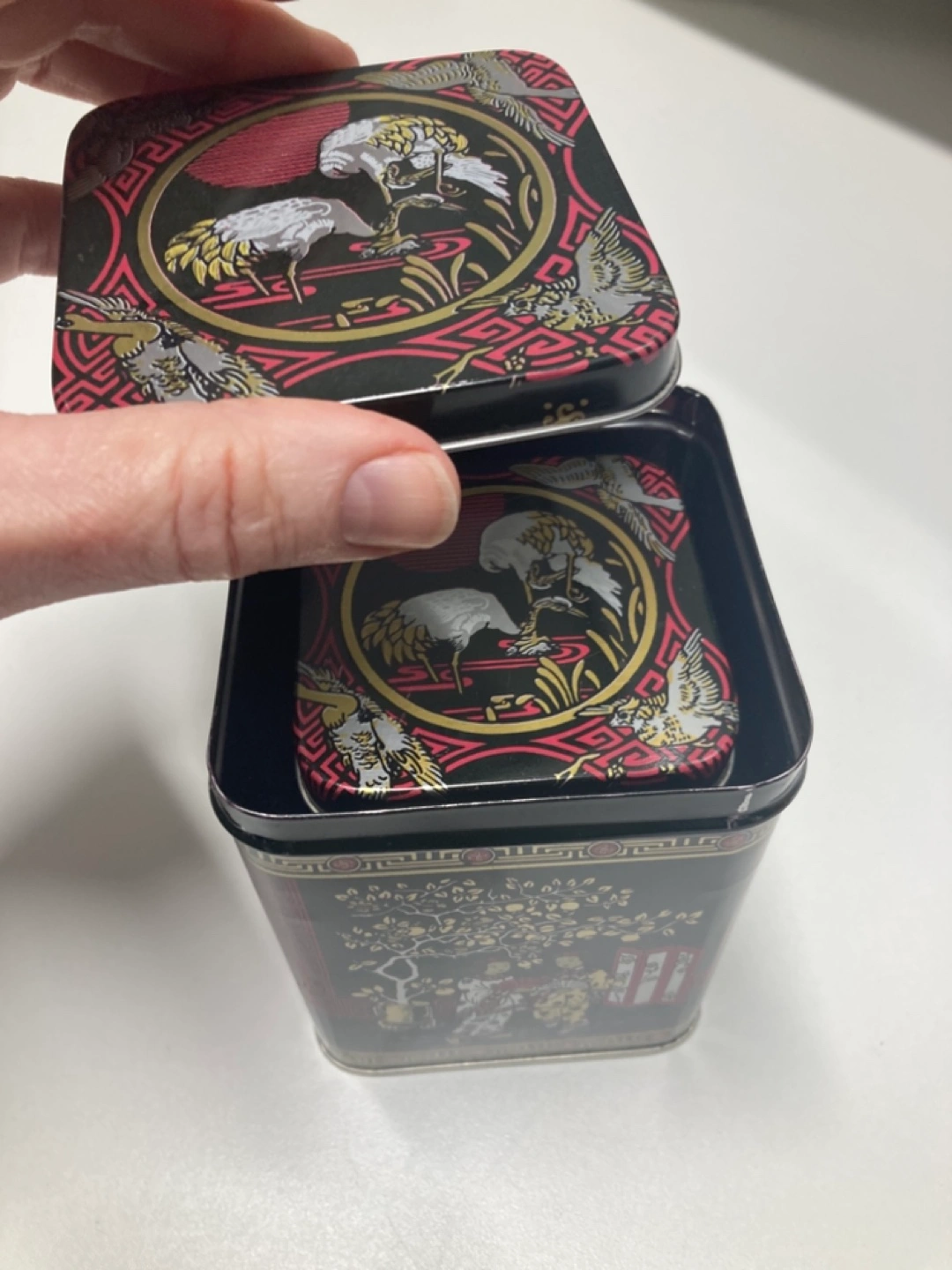 Pair of collectible metal tea tins. Nested inside one another. My hand for scale. Square shape. Features beautiful Asian-inspired artwork. Red and black colour scheme. Perfect for storage or display.
