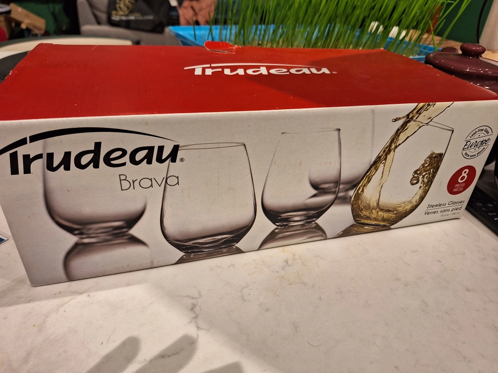 Set of eight Trudeau Brava stemless wine glasses. New in box. Durable and elegant design. Perfect for entertaining.