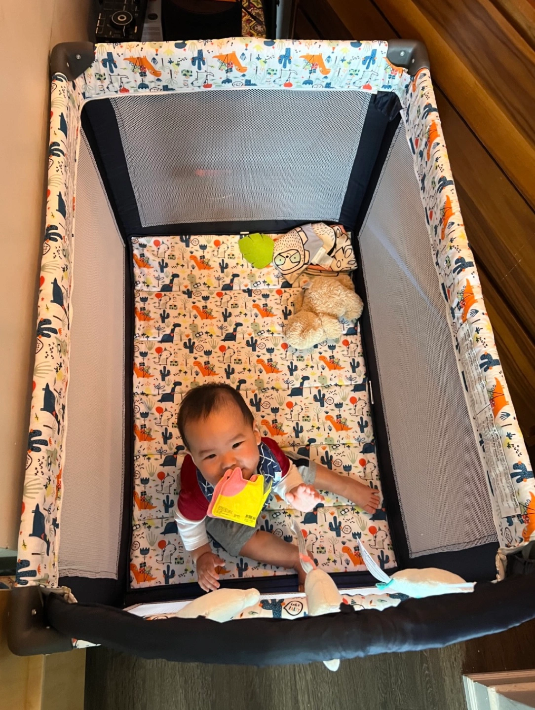 Lightweight baby playard. Includes mattress and toy bar with soft toys. Dinosaur print.