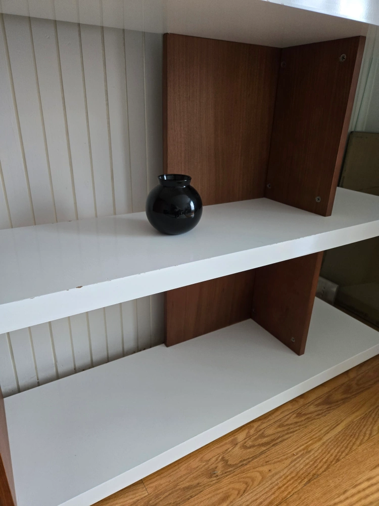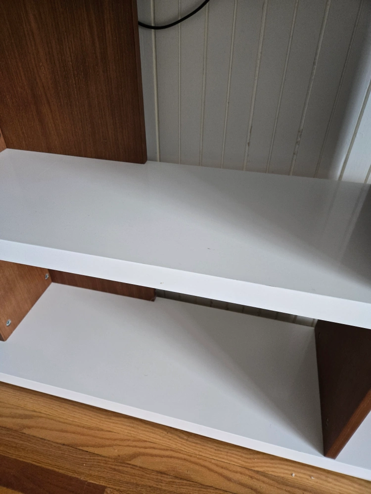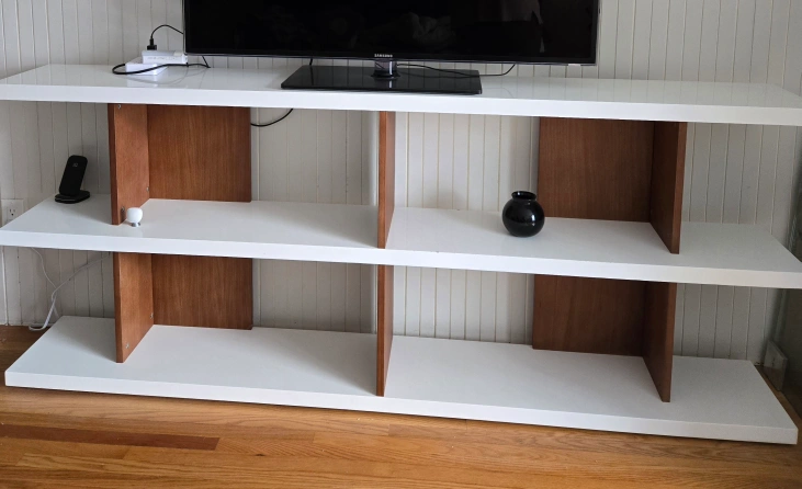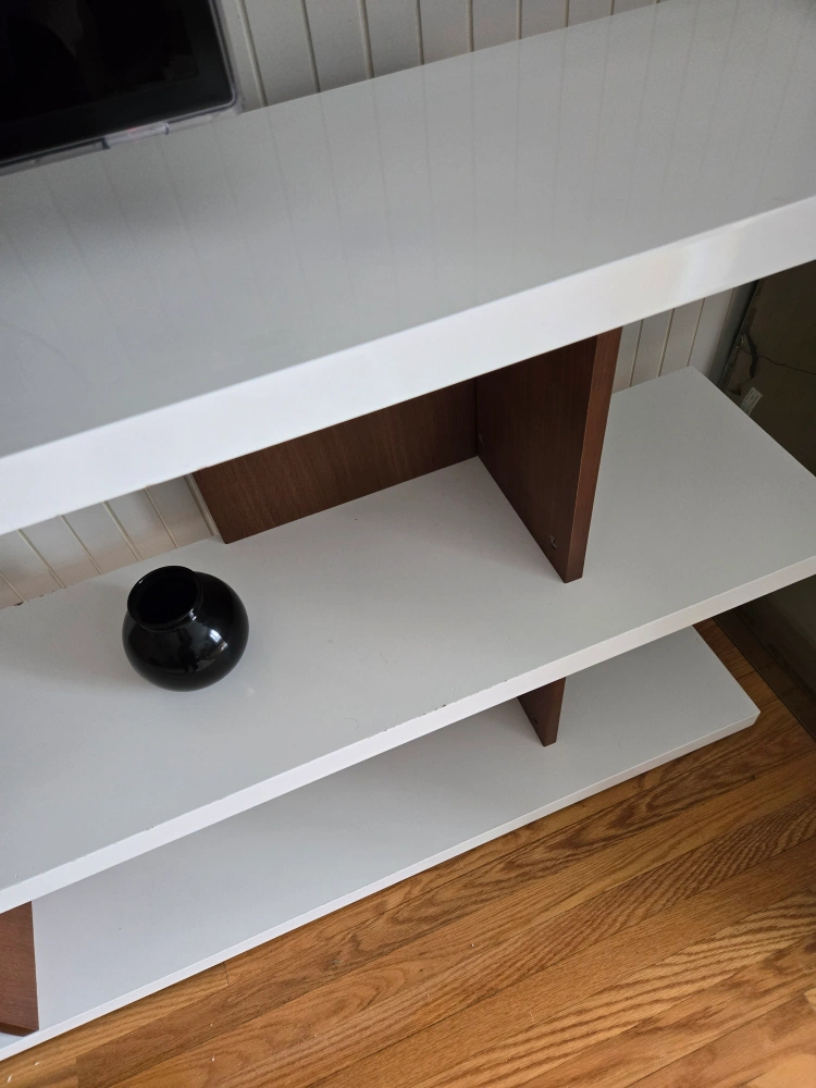 Sleek, contemporary media console. White high-gloss finish with walnut accents. Three shelves offer ample storage. Perfect for living room or entertainment space. moving sale