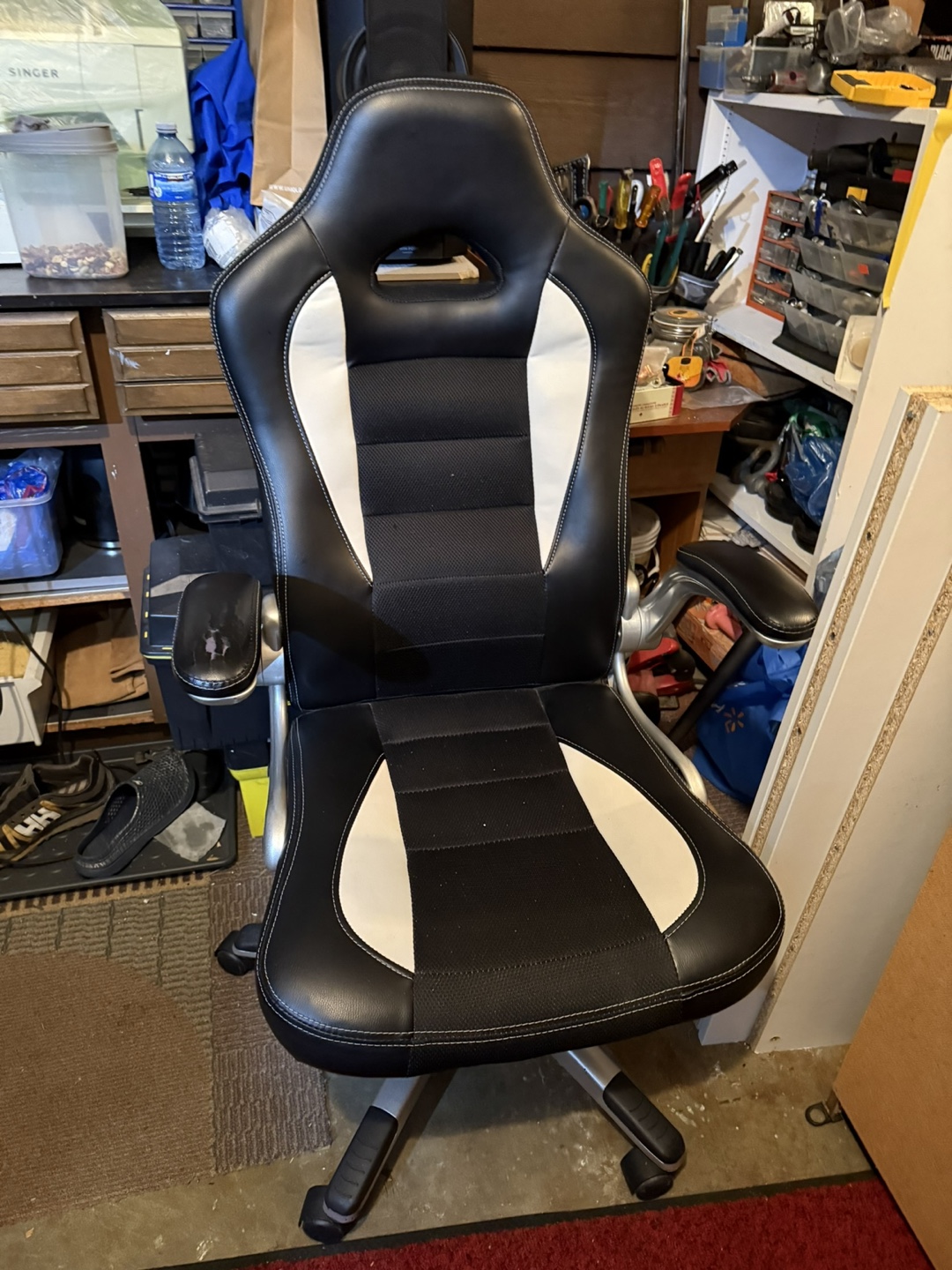 Comfortable office chair. Black and white. Features armrests and adjustable height. Great for gaming or working. Pick up Burquitlam. Call Josie at 6044206399
