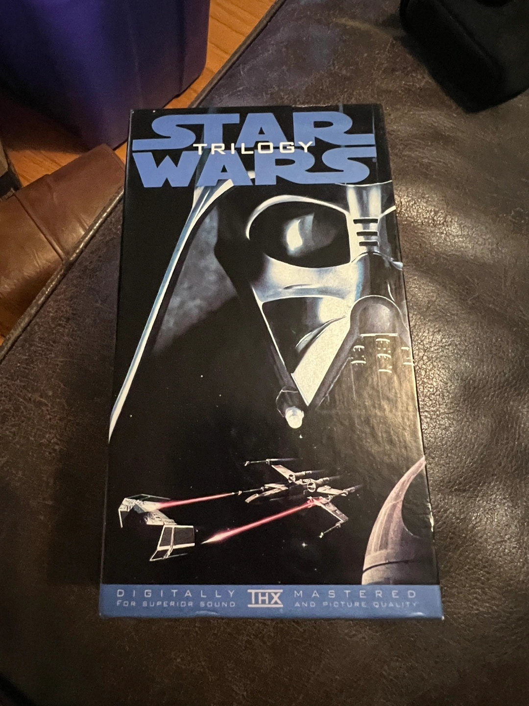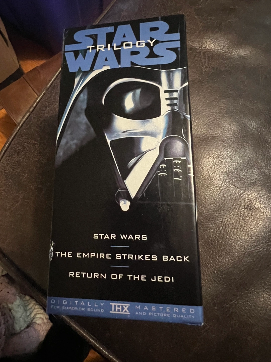Original VHS tapes of the Star Wars trilogy: A New Hope, The Empire Strikes Back, and Return of the Jedi. Digitally mastered for superior sound and picture quality. Includes box.