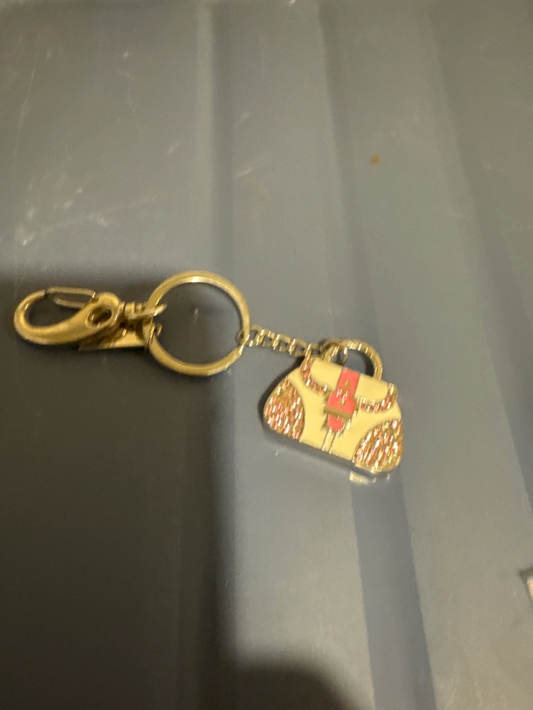 Adorable handbag-shaped USB keychain. Features pink accents and rhinestones. Metal construction. Great for fashion-conscious individuals.