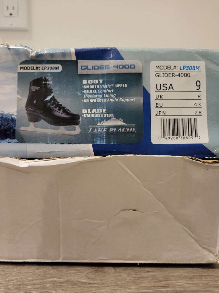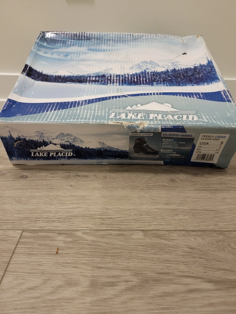 Like New, in box Lake Placid Glider 4000 ice skates. Size 9. Black leather. Stainless steel blades. Reinforced ankle support. Insulated lining. Smooth and comfortable.