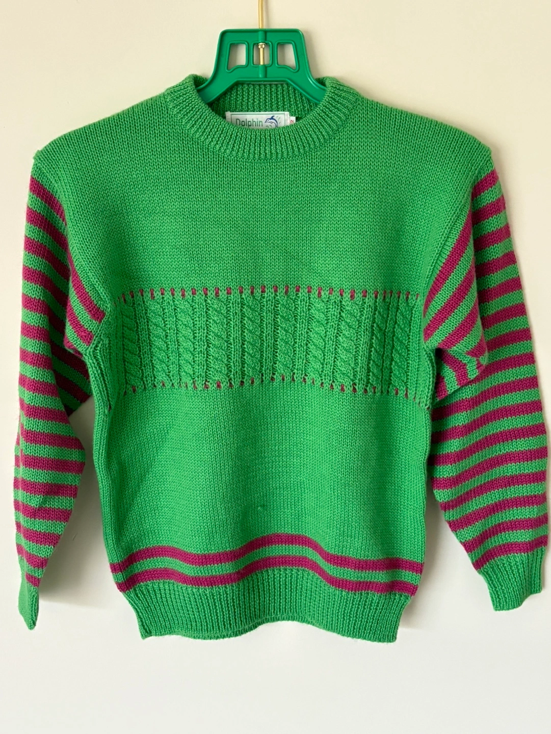 Adorable children's sweater. Green colour with maroon stripes. Knitted detail on the front. Long sleeves. Crew neck.
