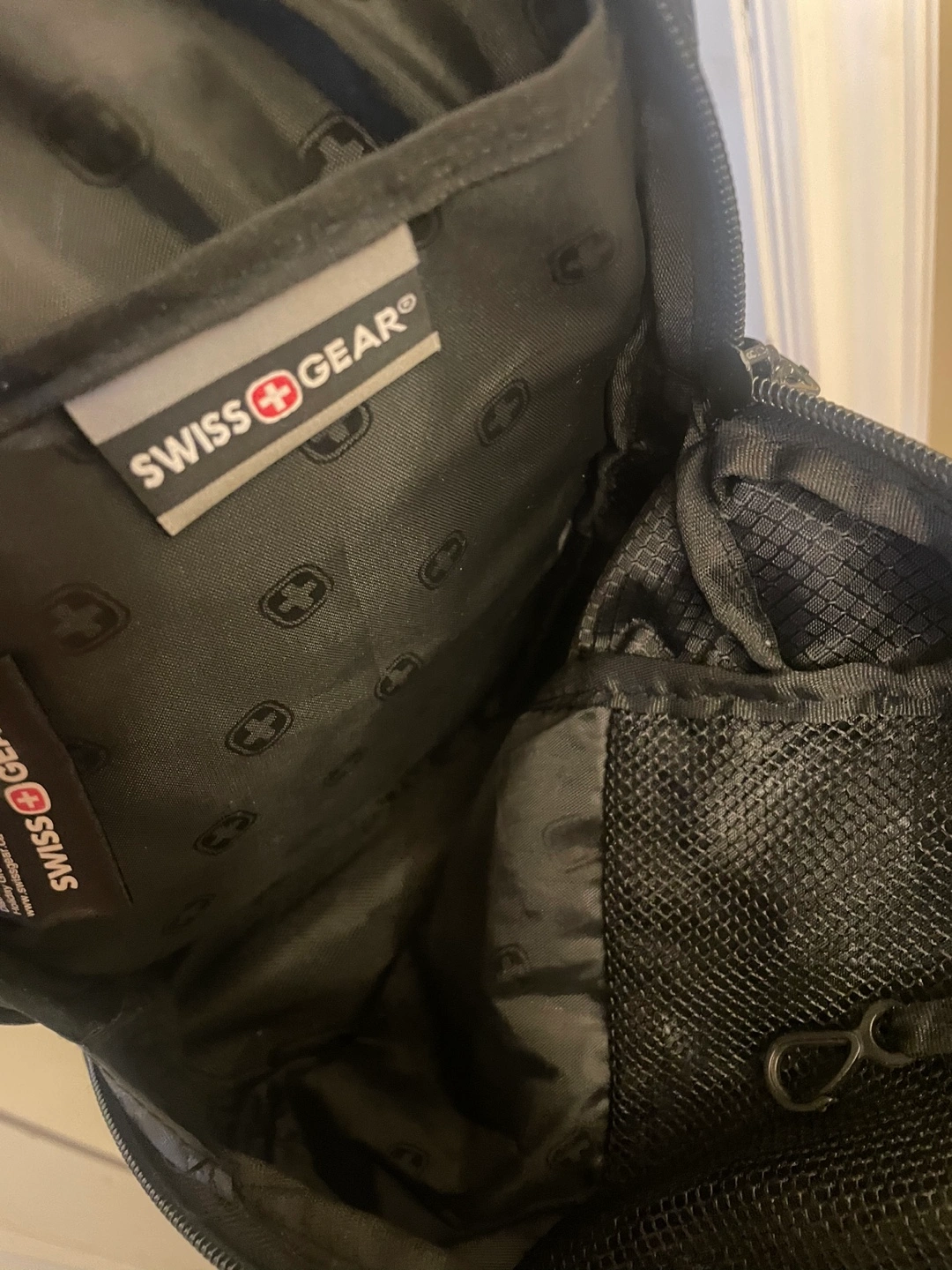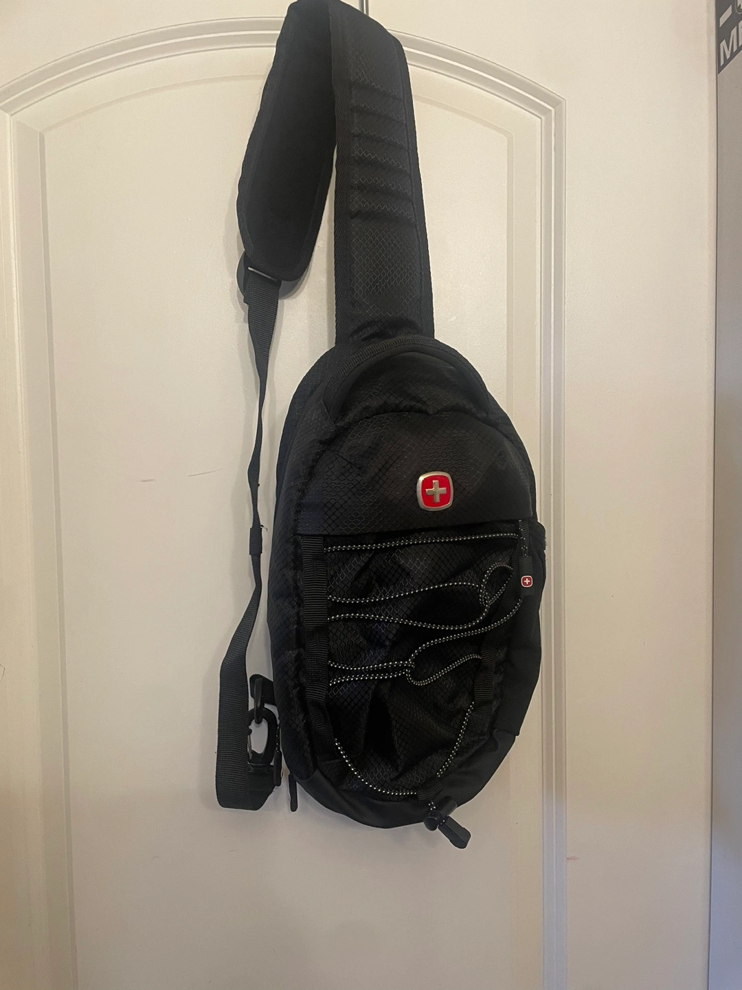 Small black sling backpack. Adjustable shoulder strap. Multiple compartments. Great for everyday use.