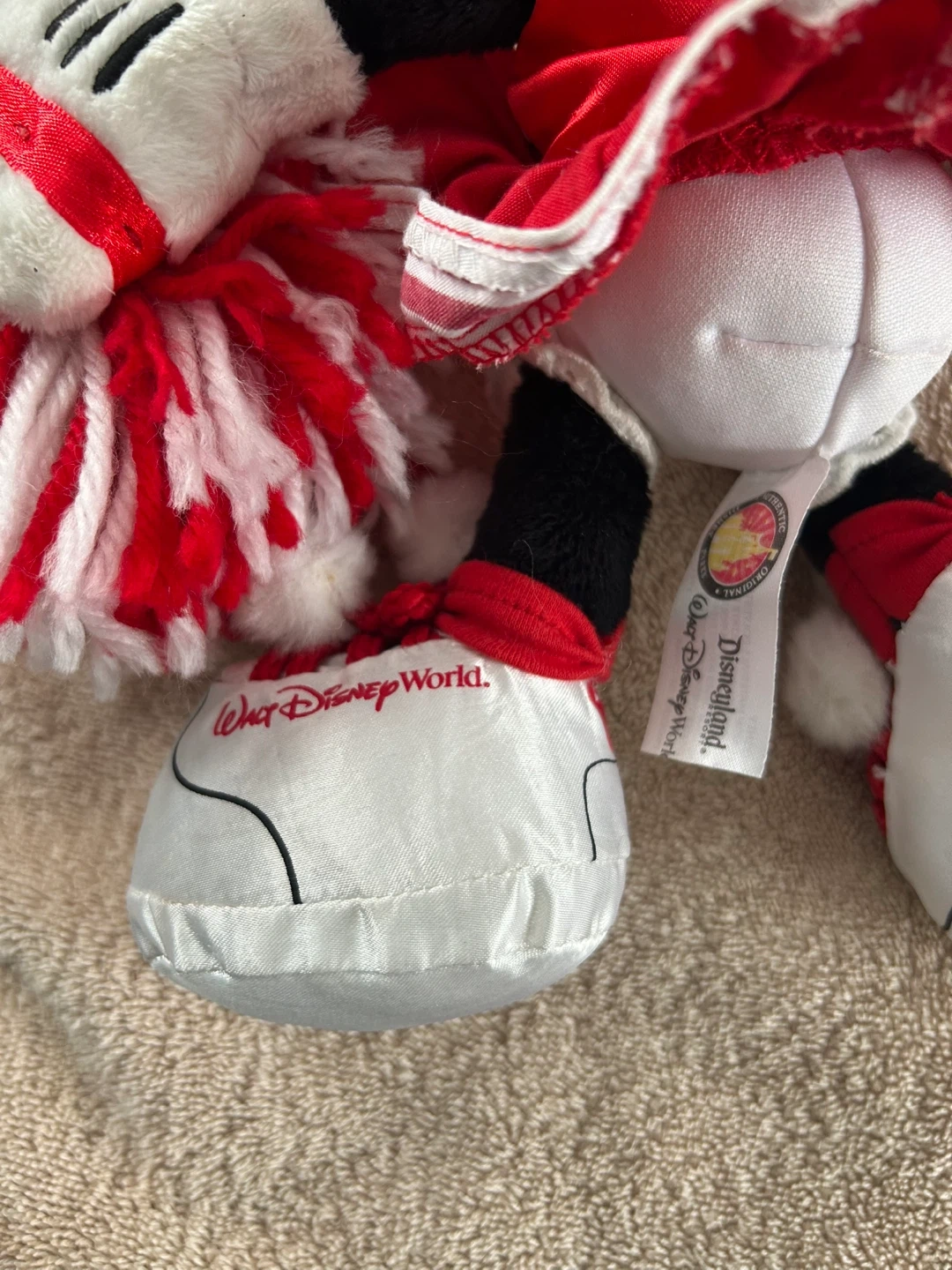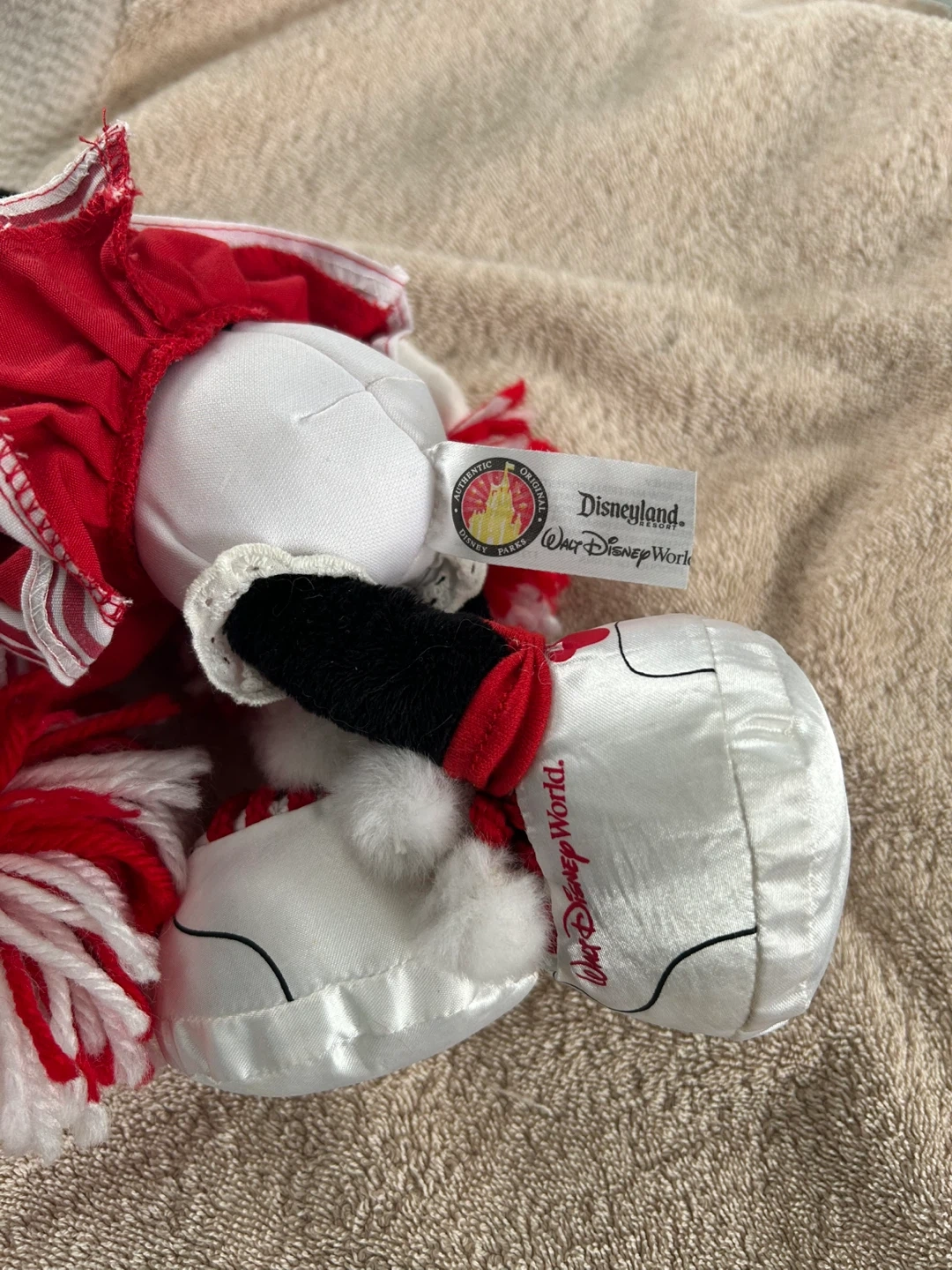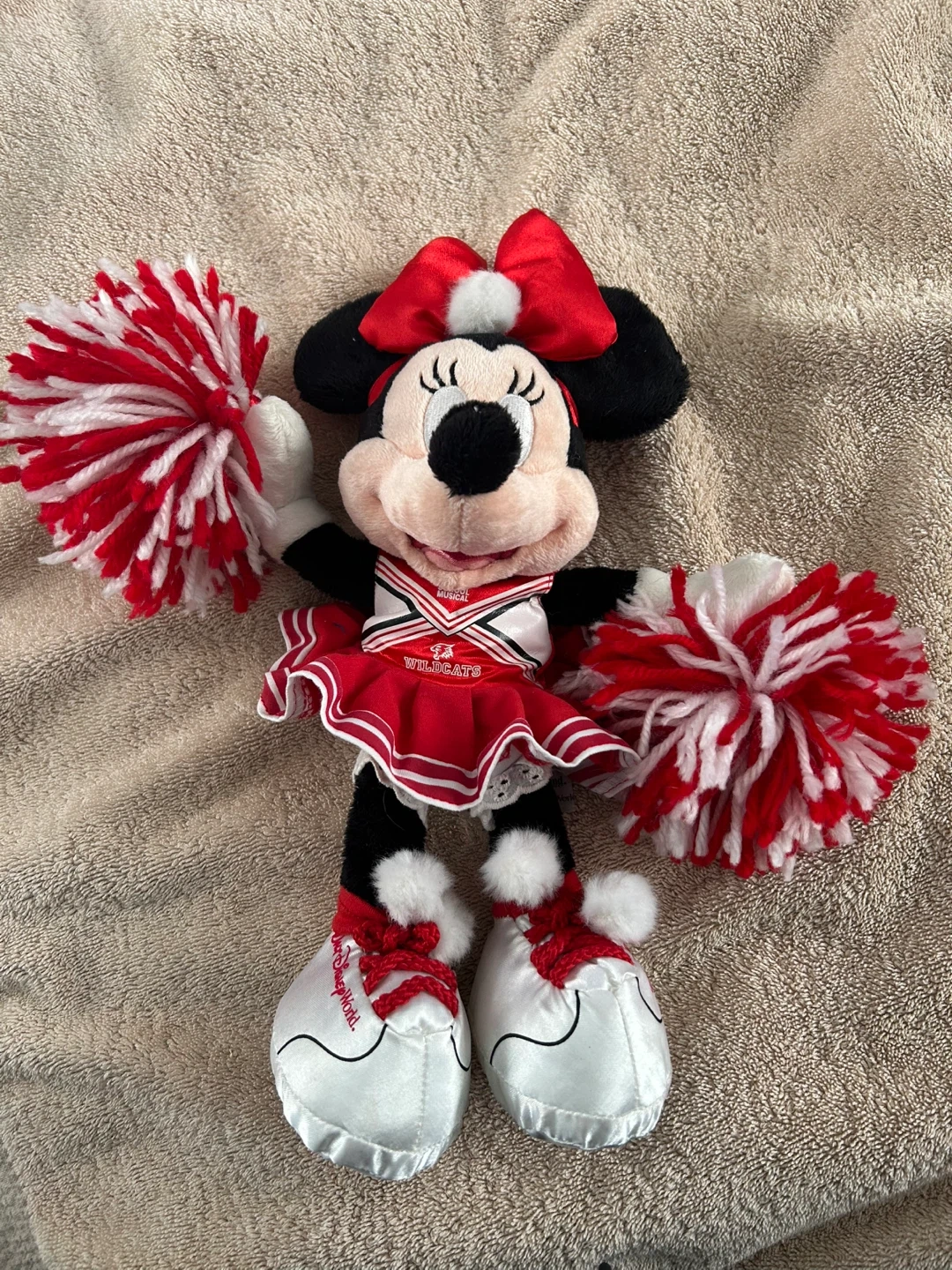 This is a Minnie Mouse plush toy dressed as a cheerleader. It has red and white pom-poms and a cheerleader outfit. From Disney World.Top reads “Wildcats “ High School Musical