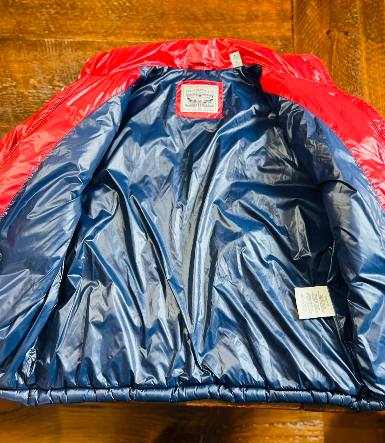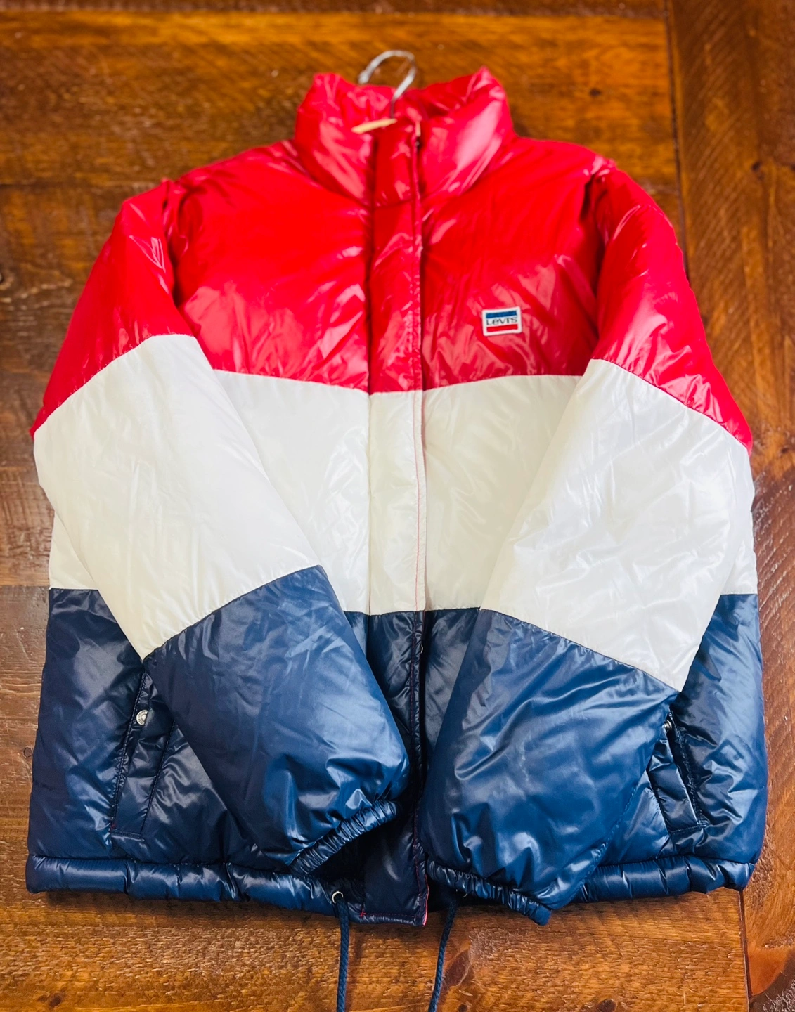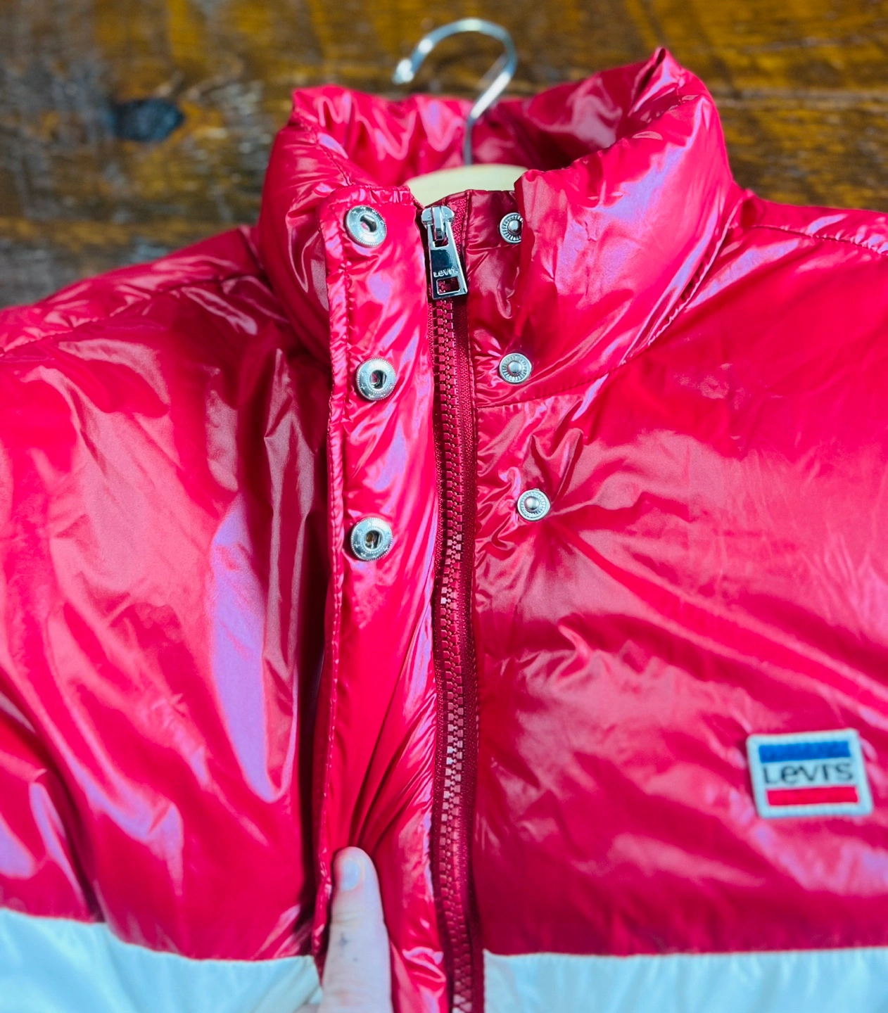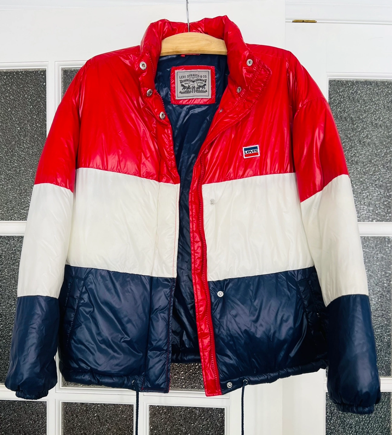 The pictured item is a Levi's women's quilted cropped puffer jacket featuring a colour block design in red, white, and blue (Levi’s’ new version of their original launch in the late 80’s - early 90’s red, white and blue colour block puffer). This jacket is in like new condition with no flaws. Colour-blocked puffer jacket. Red, white, and navy blue. Nylon shell and polyester filling. Zipper closure. Drawstring waist. All zippers work perfectly and all buttons snap! Timeless brand, light weight and perfect for everyday wear for winter, spring and fall. MSRP - retails for $200 *** Smoke free home. *** Location: Whitby - Williamsburg which is off of Countrylane between Rossland (if coming from south) and Taunton Rd. (If coming from North)