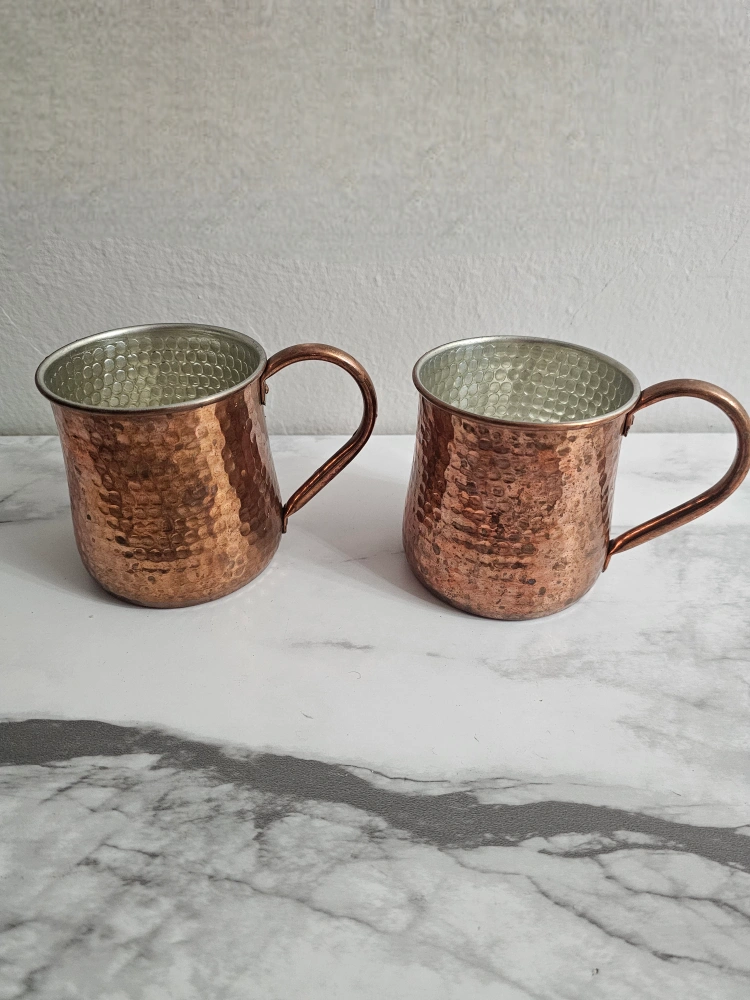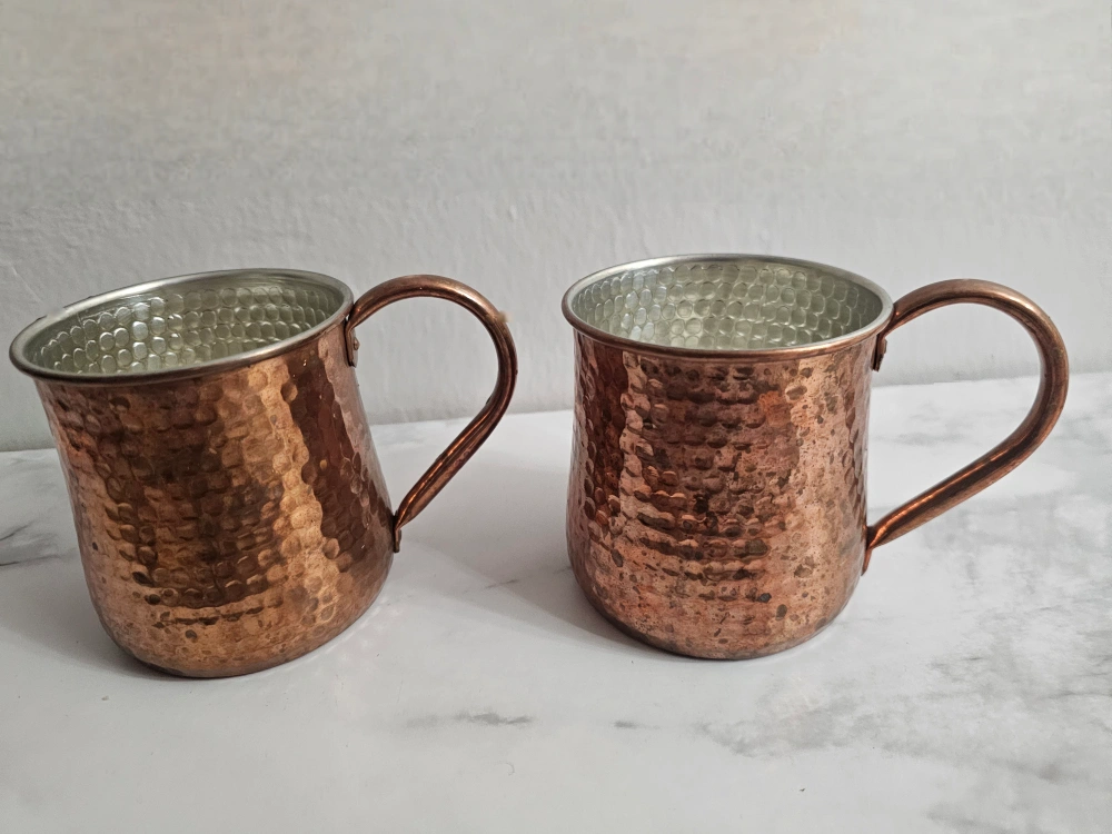 Set of two hammered copper mugs. Silver-lined interior. Perfect for Moscow Mules or other beverages. Unique and stylish.