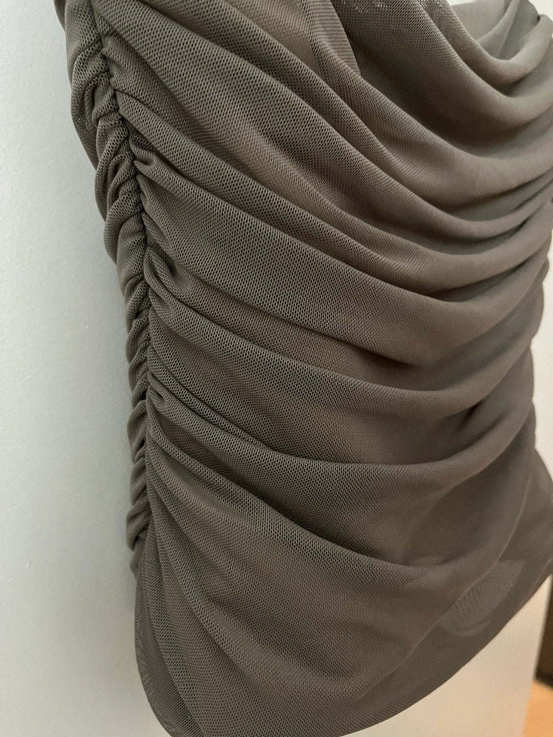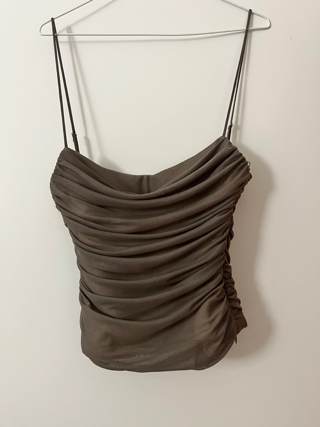 Stunning brown cami top. Features a ruched design and a mesh fabric. Lightweight and comfortable. Perfect for layering or wearing alone.
