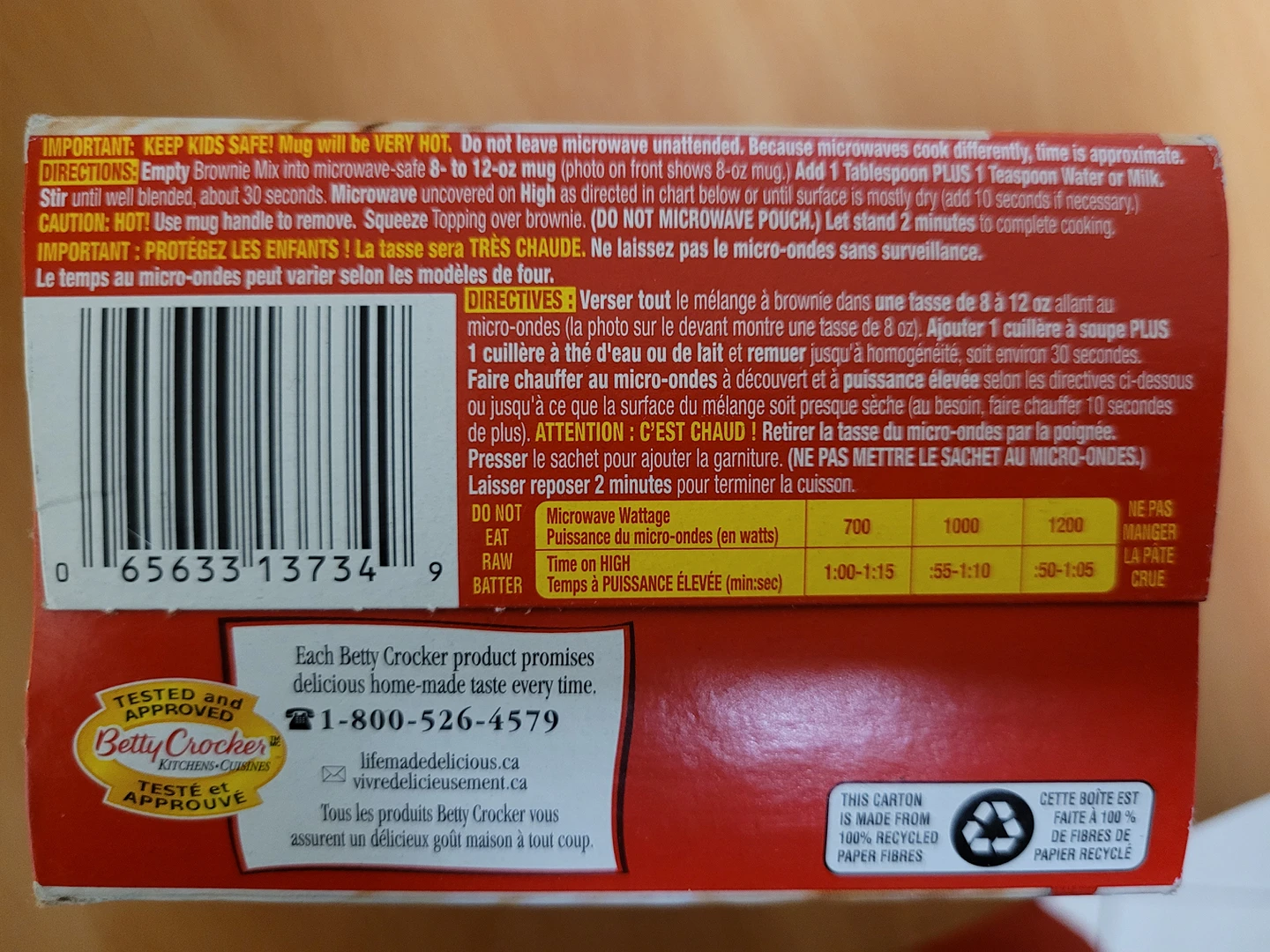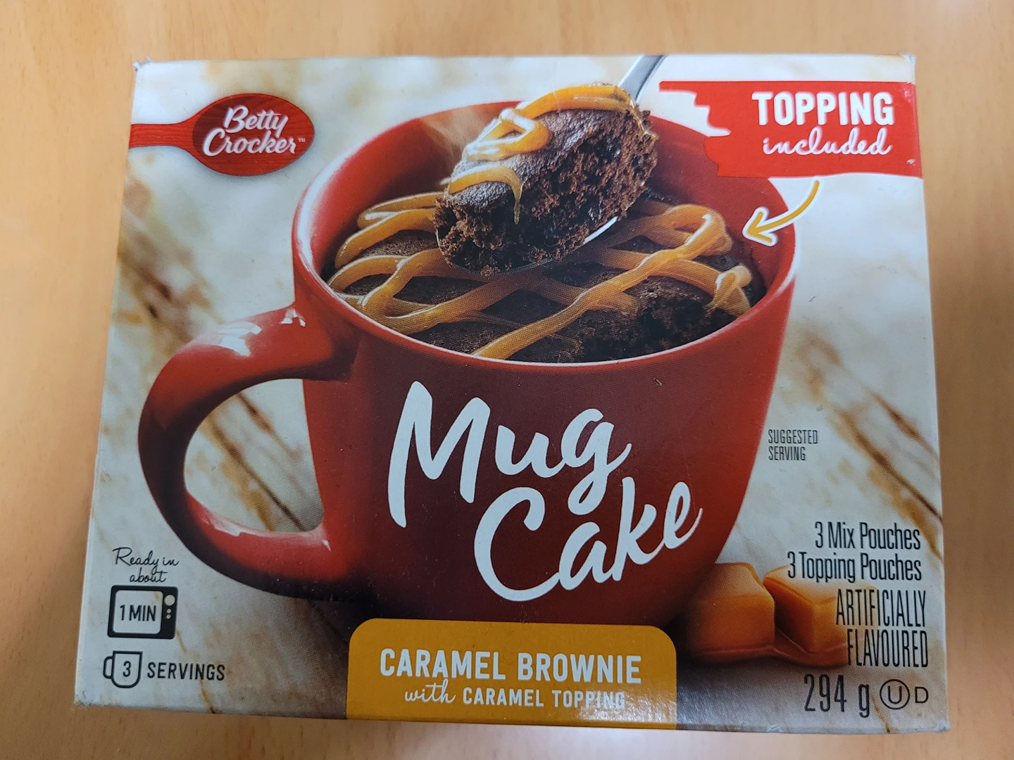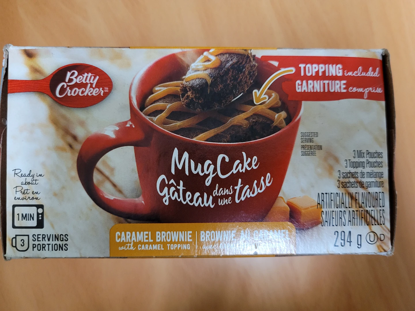 * Expiry date was Nov. 08/2022, but dry foods such this usually are fine to consume several months or longer after expiry** **Box with 3 pouches=3 mug cakes** **Also includes 3 caramel sauces** ** For the kitchen savvy, it doesn't need to be cooked in the microwave, it can also be baked in oven all 3 pk at once for a bigger portion too.**