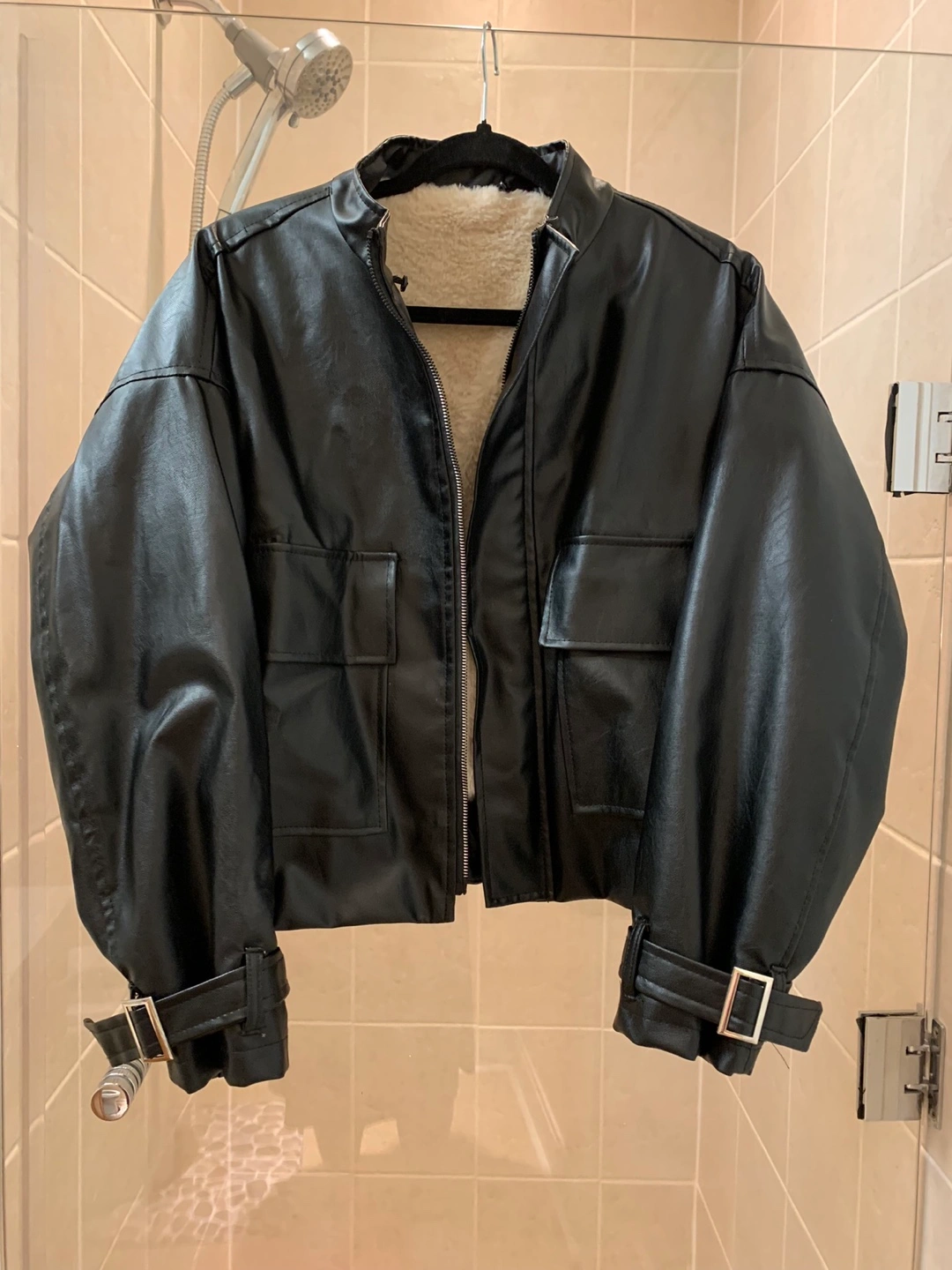 Cropped jacket. Features black faux leather and cream coloured shearling. Zip closure. Functional pockets. Belted cuffs. Warm and stylish.