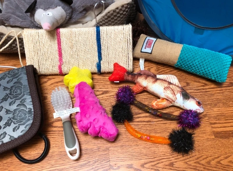 comes with 13 basic items needed if you have a cat! super useful to just buy a bundle to save money and not worry about buying multiple items