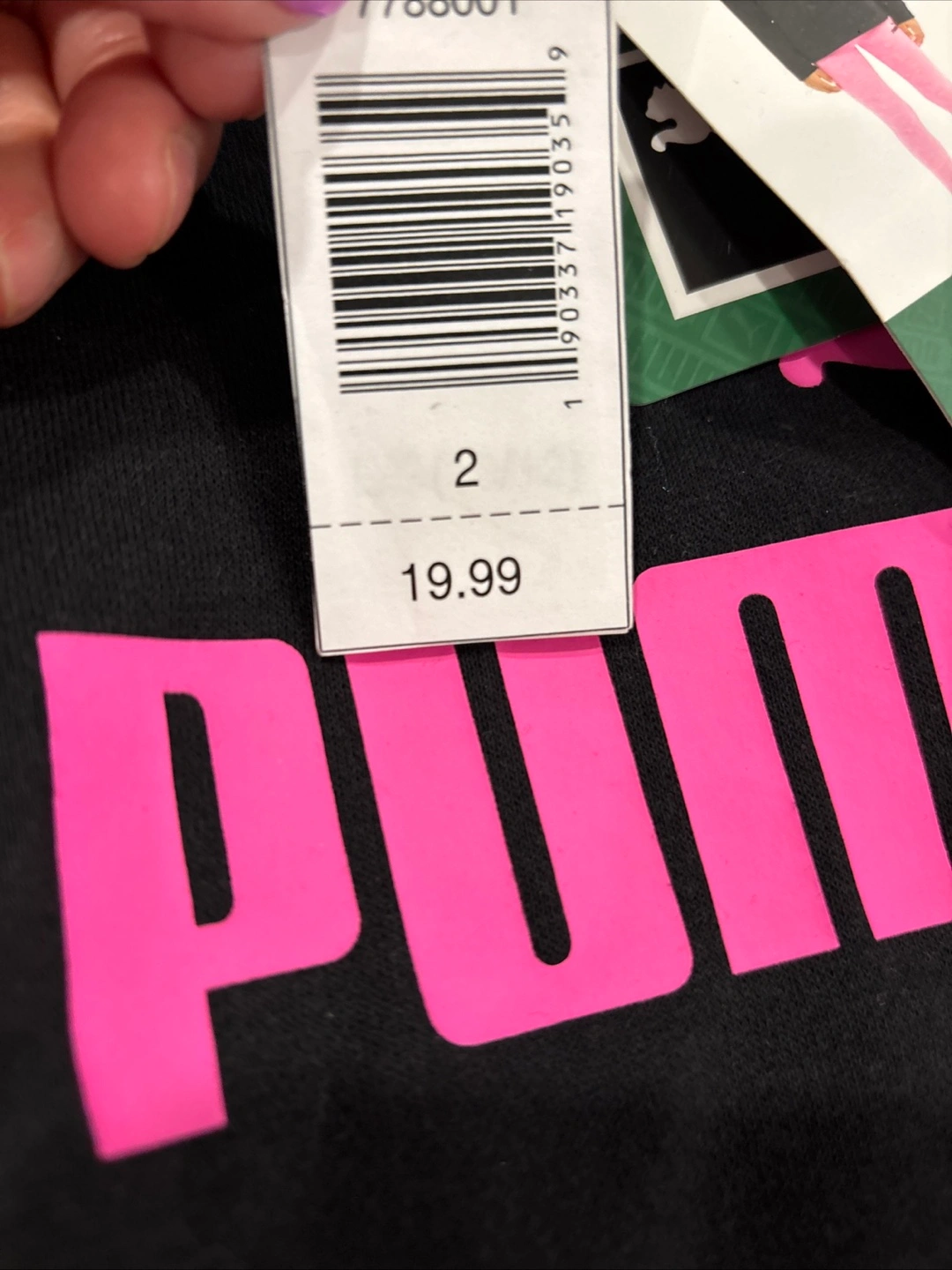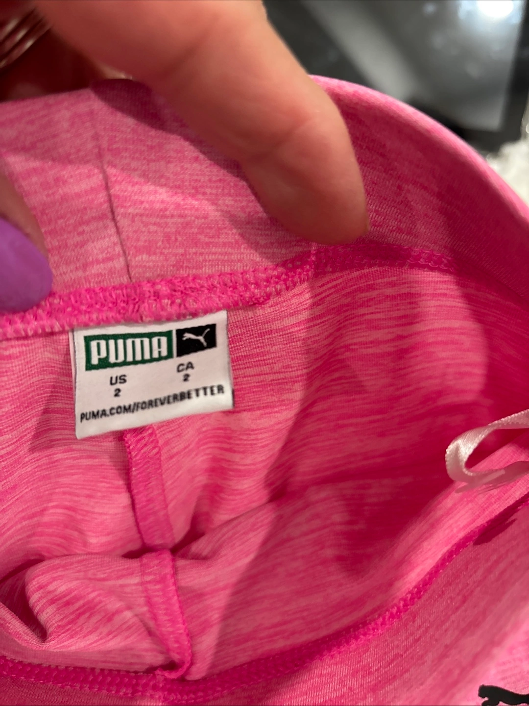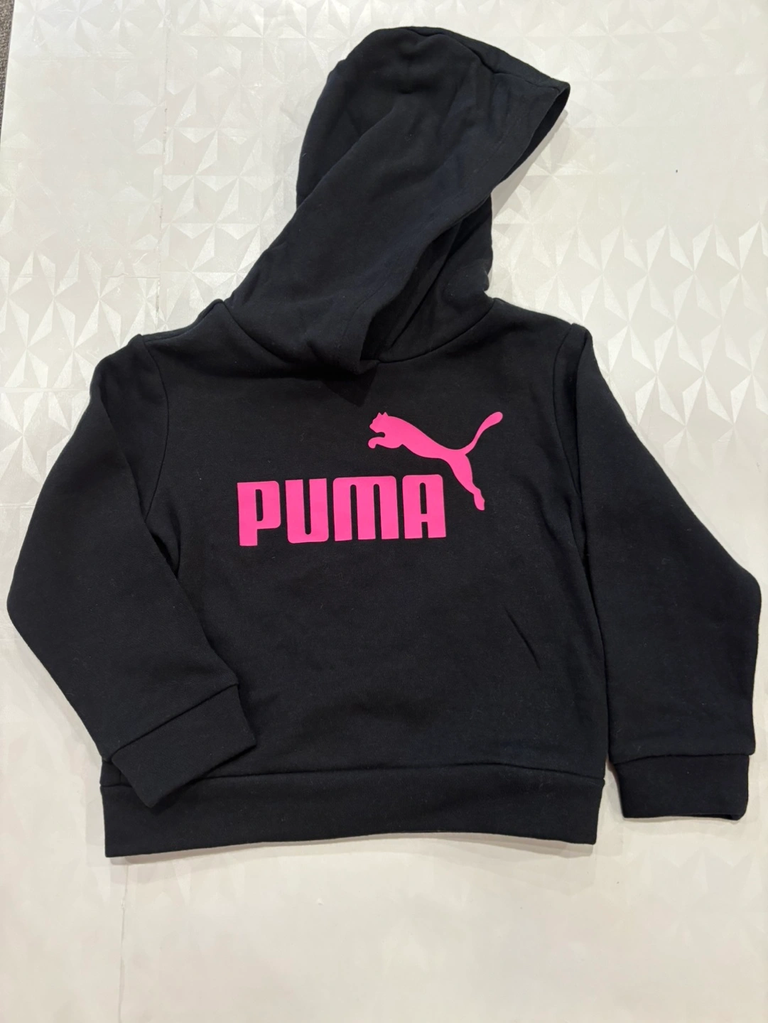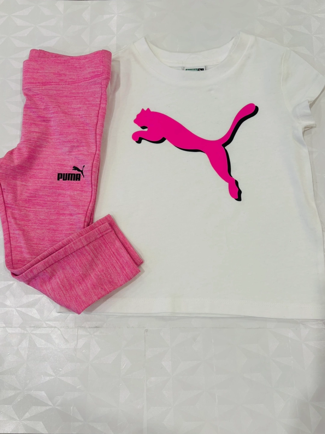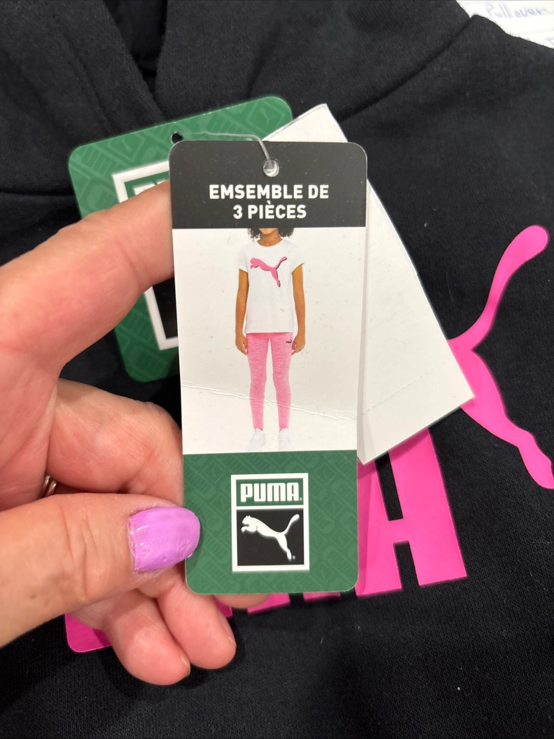 This adorable girls Puma outfit includes a black hoodie, white t-shirt, and pink leggings. Perfect for playtime or lounging around. Soft material, comfortable fit. Spring, Summer, Fall.