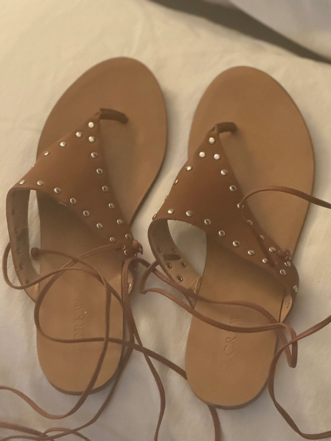 Beautiful brown leather sandals. Studded detailing. Lace-up design. Flat sole.