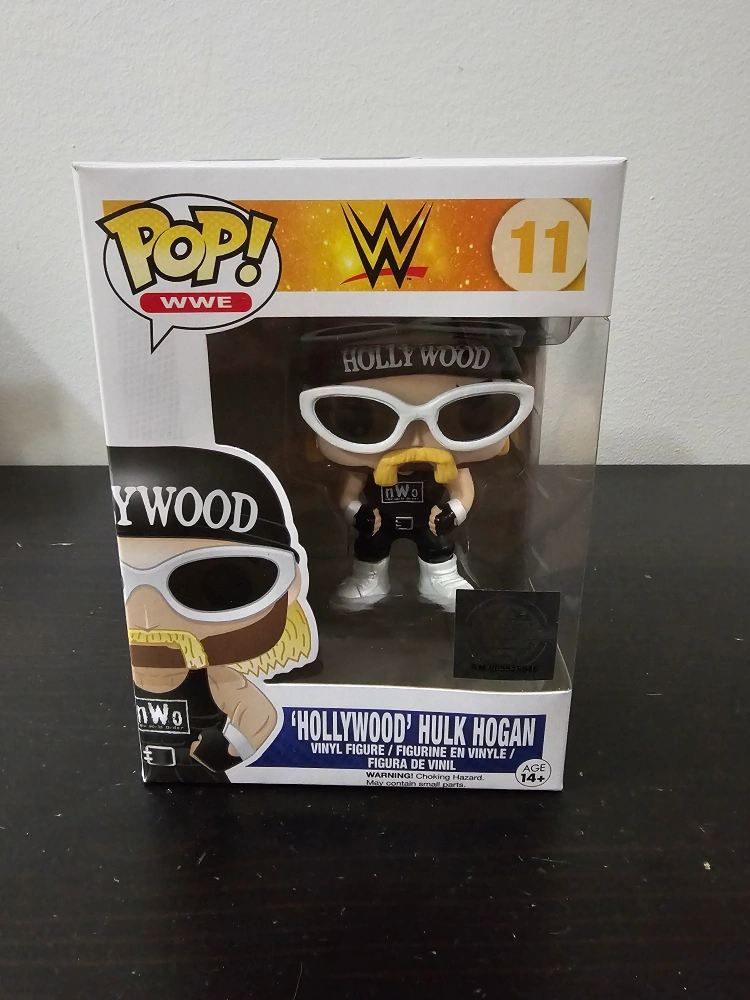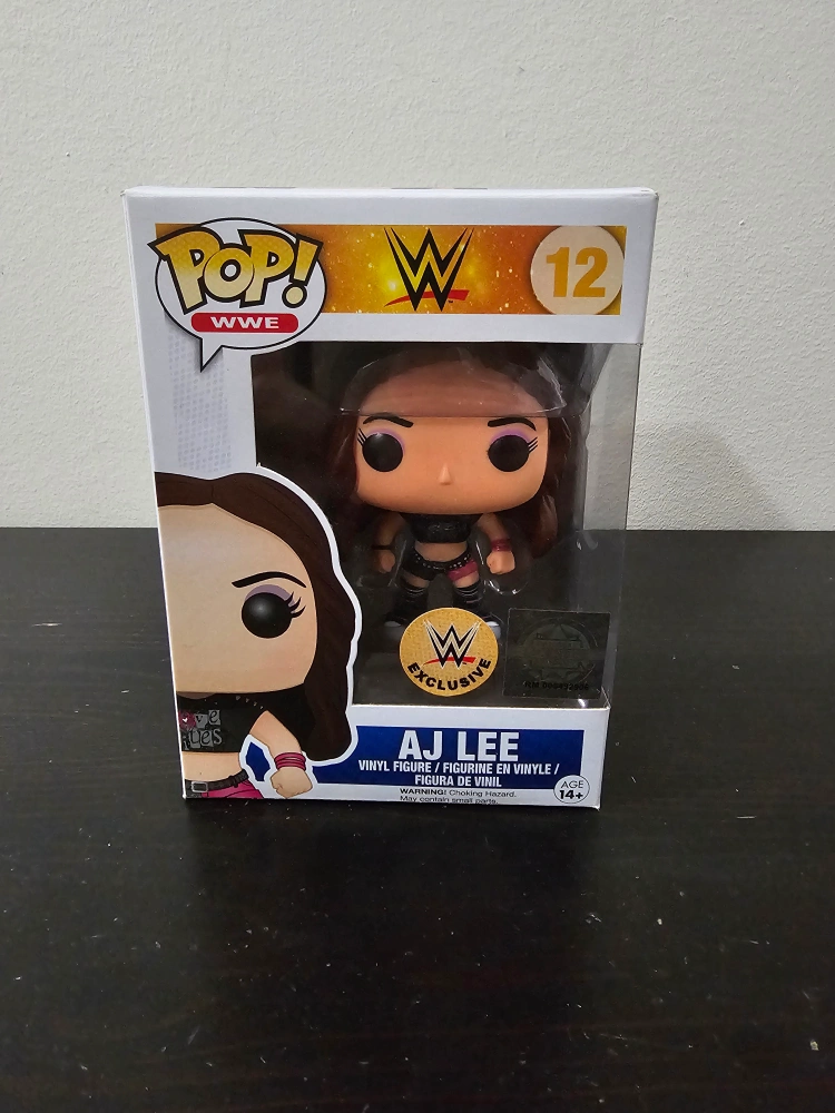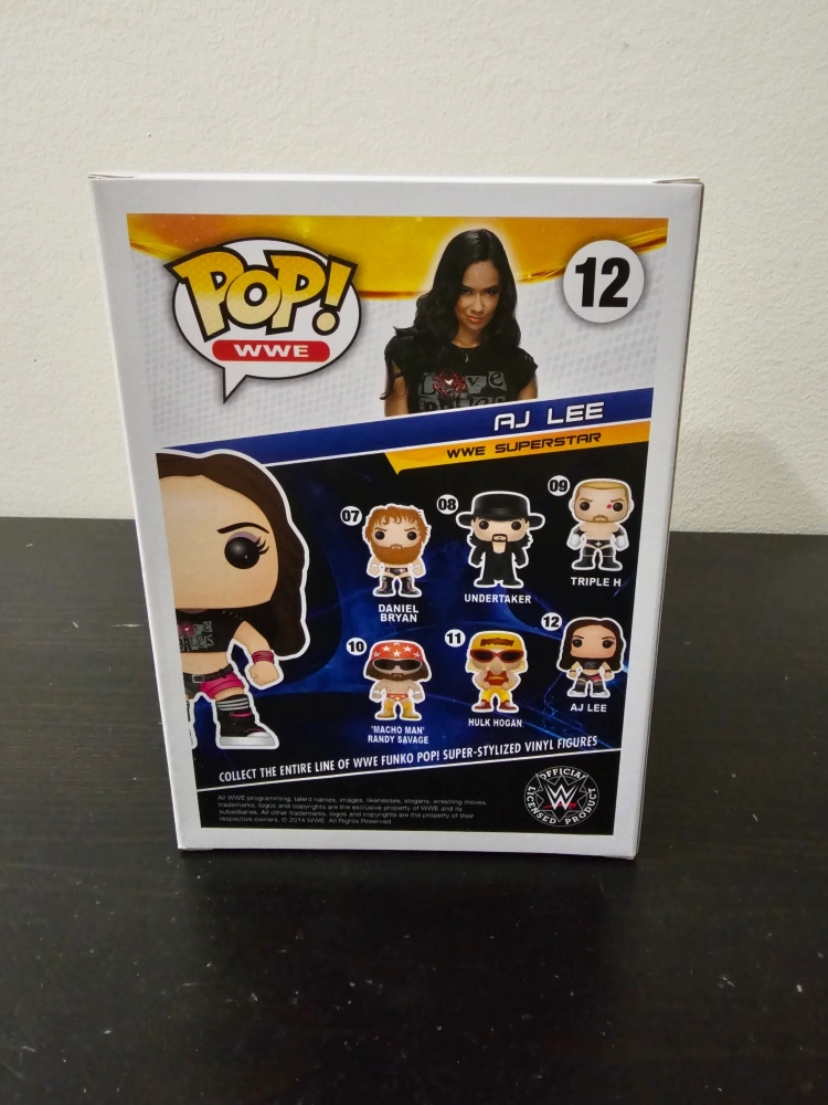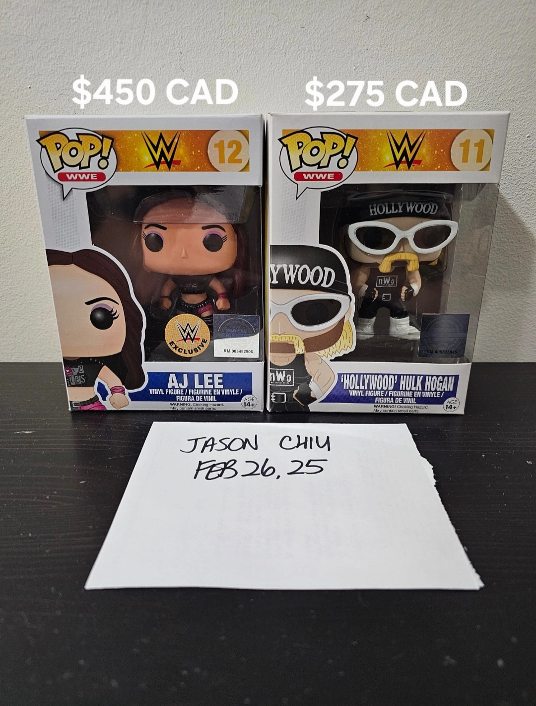 Two WWE Pop! Vinyl figures. One is AJ Lee, the other is Hollywood Hulk Hogan. Both are in their original packaging. Collector's items. Box condition NM. Prices in picture.