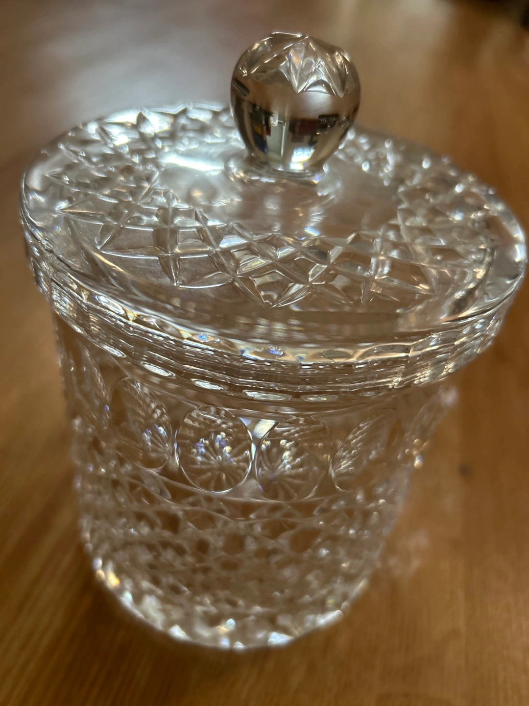 Beautiful cut crystal jar with lid. Perfect for storing candies or other small items. Measures approximately 4 inches tall.